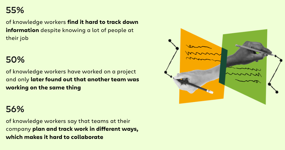 我们的2024年团队状态报告调查了5000名知识工作者,进一步验证了这一常见挑战。55%的受访工作者报告他们难以找到必要的数据。此外,50%的人还分享他们发现自己在重复另一个团队已经在做的工作。