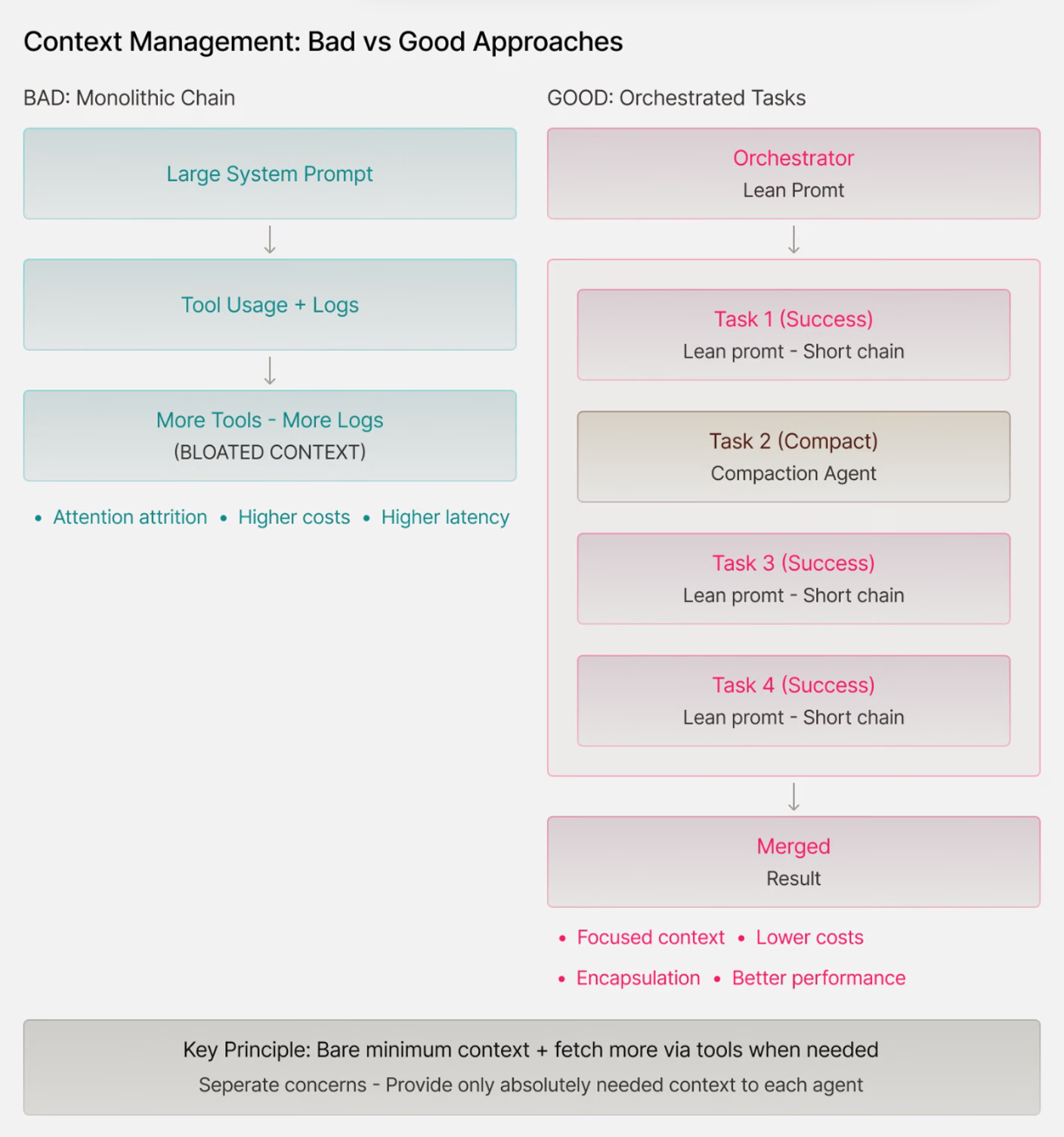 来自反馈循环的日志和其他制品可能很快就会使上下文变得臃肿。自动应用的简单上下文压缩工具可以提供很大帮助。封装对于面向对象编程来说是一个炒作词汇,但对于上下文管理来说更加重要:分离关注点,只为你的智能体解决方案的每一部分提供它绝对需要的上下文。