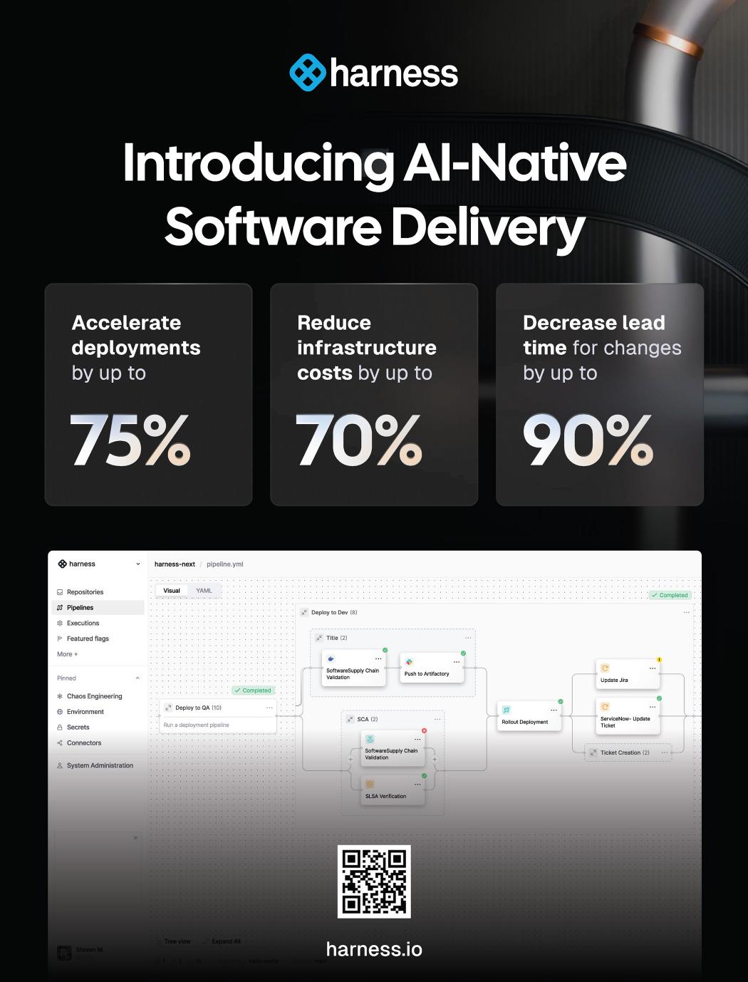 相比之下,现代软件交付简化并加速了从开发者计算机到最终用户获取软件的整个过程。部署频繁、低调、低风险且高度自动化。但我们正进入一个新时代——一个超越自动化的时代。下一个前沿是AI原生(AI-native)软件交付。AI原生交付将AI编织到软件交付生命周期的每一层,使智能代理能够做出决策、优化工作流程并实时适应。这些代理——从代码和DevOps到安全和测试——自主协作,强制合规性,自愈基础设施,并使用强化学习持续优化软件交付管道。这一转变标志着从被动治理到主动治理,从孤立工具到统一生态系统,从静态自动化到动态自治的转变。