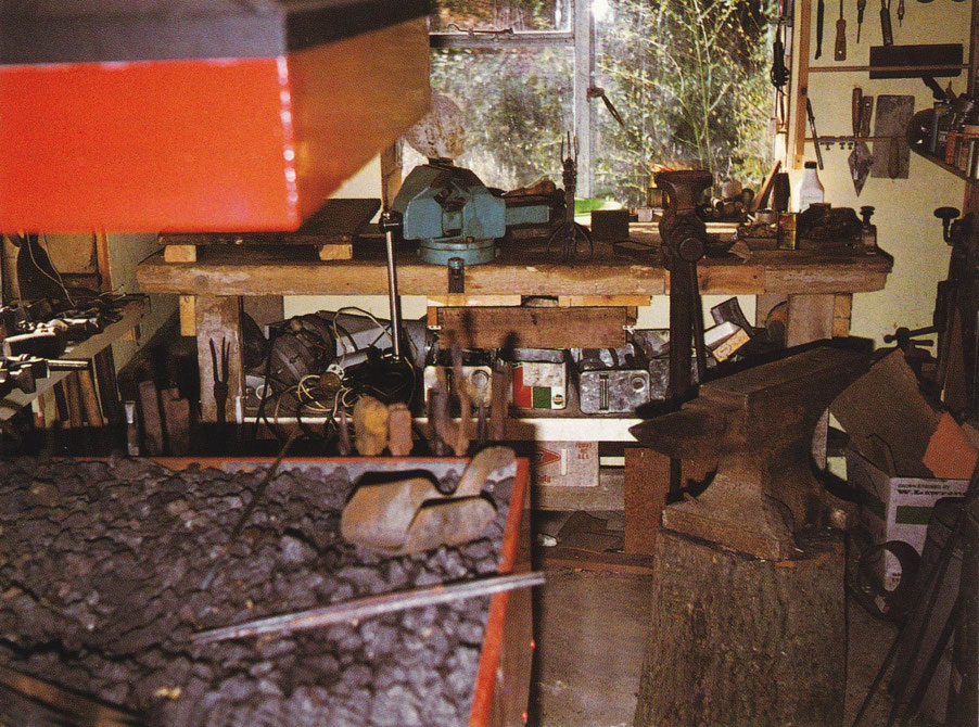 作者的第一个工坊。刚好够放一个焦炭锻炉、铁砧和固定在工作台上的台钳。