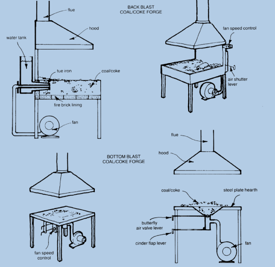 固体燃料炉通常在炉膛前部附有一个水槽。必须要有某种形式的水箱或水槽来冷却或淬火金属。一个旧油桶可以用,尽管使用长水槽有一些优势,因为可以将热的金属条横放在上面,在热处的两侧淬火区域,而不会在地板上洒太多水。