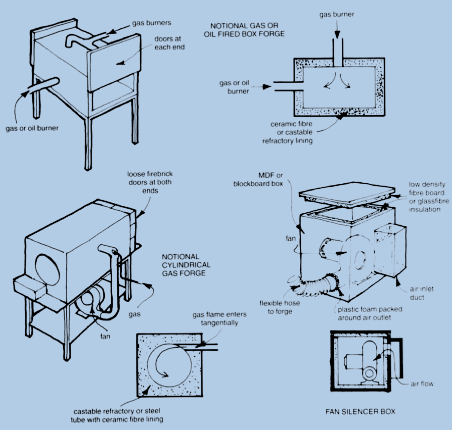 由于需要烟道,煤或焦炭炉往往会固定工作坊的布局。它的位置需要仔细考虑。使用丙烷的燃气炉,或燃烧煤油的燃油炉在通风良好的工作坊中不需要烟道,因为燃料燃烧清洁,没有有害烟雾。但应该记住,任何碳氢燃料都会产生二氧化碳,在空气供应受限的情况下还会产生一氧化碳。因此良好的通风很重要。这些炉子提供一个加热室——类似于陶工的窑——通过前后的门进入。由于它们结构相对轻便,不需要固定烟道,可以放在装有脚轮的底座上,并根据需要移动。这使得工作坊布局更加灵活,能够根据特定工作安排炉子的位置。