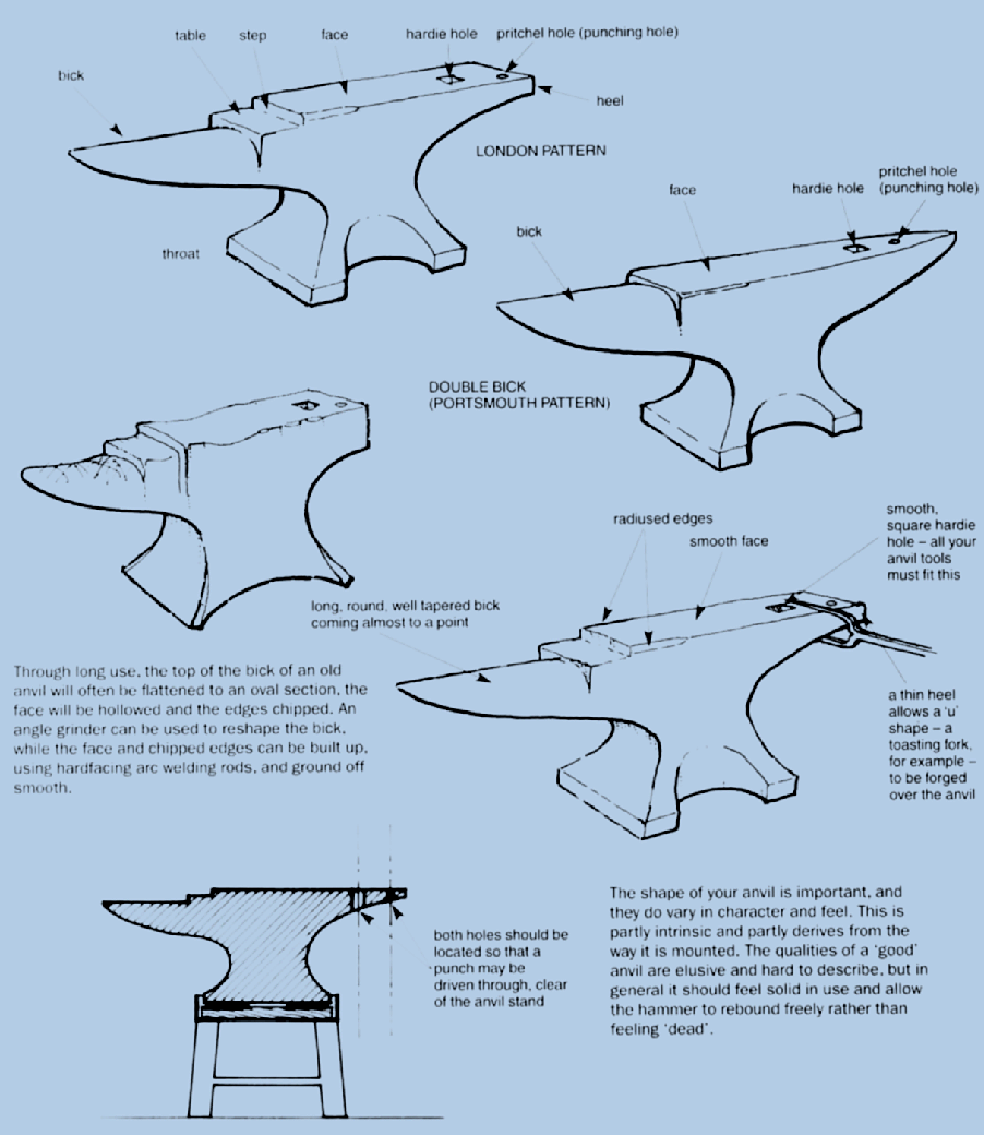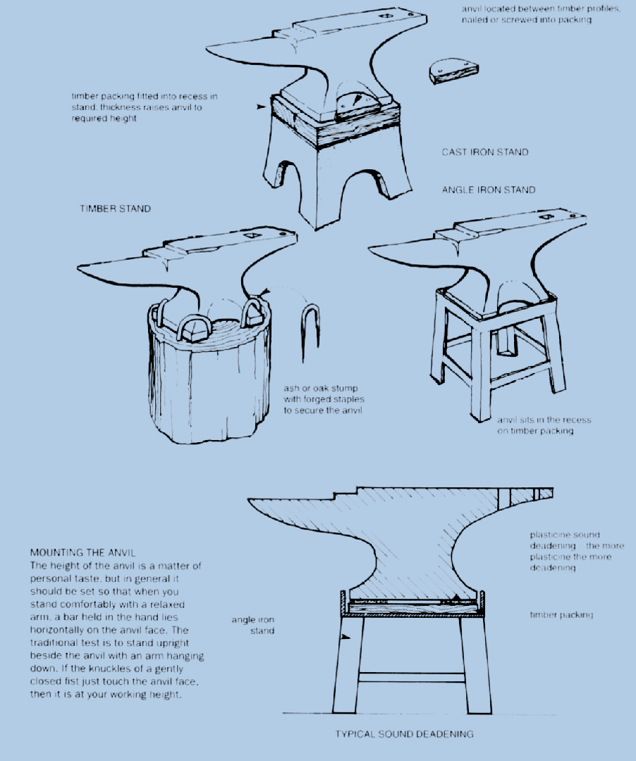 必需的设备是炉子、砧、一个重型台钳和一个工作台。仅用这些和一些手工工具就可以完成很多工作。添加一个手持电动角磨机、一个电弧焊机以及许多其他工具会有优势,这些将在章节中介绍。但无论你还有什么或渴望拥有什么,炉子和砧是工作坊的核心。