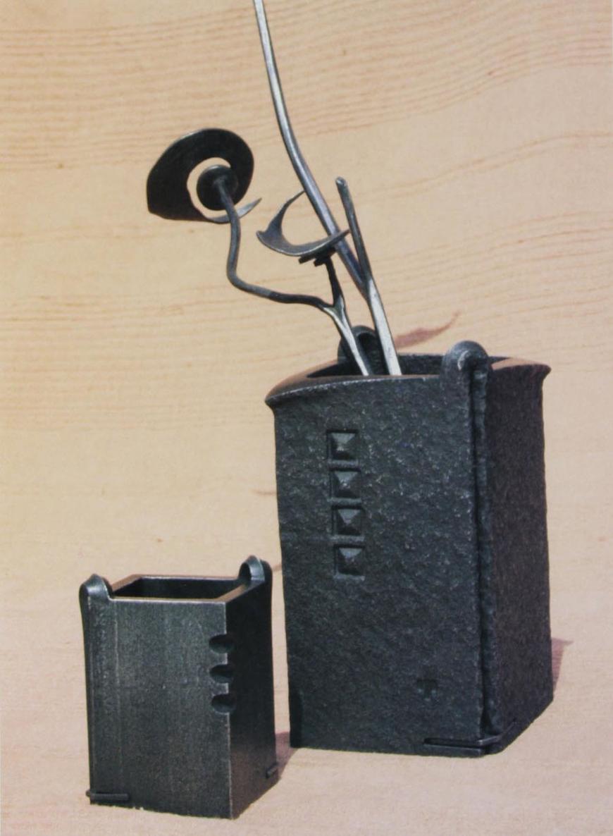 前页:作者制作的容器和锻造低碳钢树枝。容器由低碳钢角钢制成,切割并热折叠以将底座固定在槽中,带有切割和冲孔装饰。