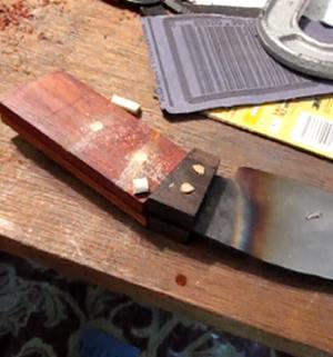 胶水凝固后,可以用丙酮清理。用锉刀将黄铜销钉锉平。锉平刀柄使其表面光滑并抛光——可以涂几层桐油(Tung oil)。