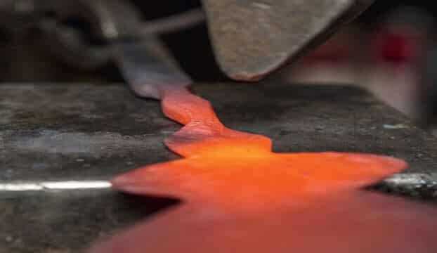 当您注意到金属在锤打时开始折叠时,将刀刃放在铁砧上,将边缘锤回平整。需要注意的一个重要方面是,您不应该在刀尖上花费太多时间,特别是如果它是弯曲的或非常薄的。在最后的锻造阶段再处理它。