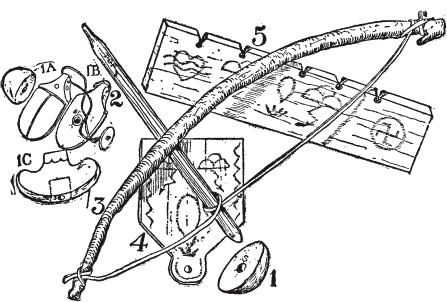 是一根木棍或树枝(图3、3E、3F和3G),大约一英尺半长,直径近一英寸,有一个永久的弯曲——这个弯曲可能是天然的,也可能是人工制作的。弓上连接着一根松弛的皮带或某种耐用的绳子。爱斯基摩人比印第安人更有创造力,他们用象牙制作精美的弓,从海象牙上雕刻,将其削薄并用一条松散的海象皮条穿起来。
