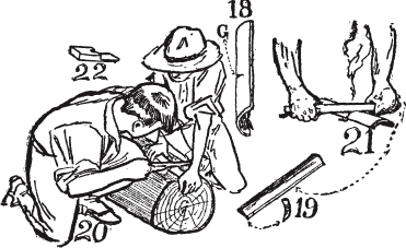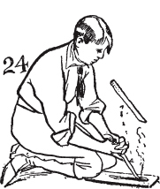 最简单的摩擦生火方法是犁耕法,只需要一块带有凹槽的火板和一根在凹槽中来回推拉的摩擦棒([图24])。以攀登麦金利山闻名的贝尔莫尔·布朗船长在火柴被水浸湿时,就用这种方法生火。然而,这种方法比用绳索和弓生火更困难。这种方法至今仍在马来群岛使用;当地人将火板放在树桩或石头上,跨坐其上,用尖头钻具在板上来回犁耕,直到生火。用时:四十秒。