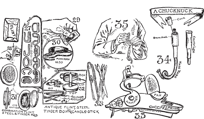 白人的方法,如何使用燧石和钢片。在哪里获得燧石和钢片。火石、火绒盒、引火棒和火柴。真正的磷火柴。缓燃引信。如何捕捉火花。燧石和钢片的替代品