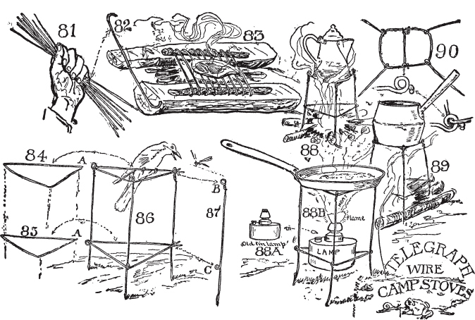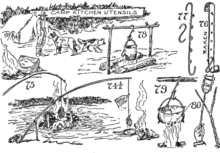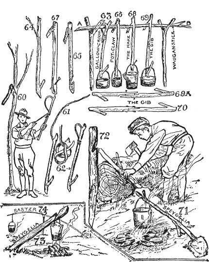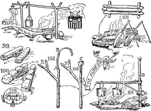 短口粮的个人经历。最原始的烹饪装备。营地锅钩、绞刑架钩、锅爪、钩子、吊臂、斯佩格利亚钩和萨斯特钩。电报线烹饪工具、铁丝烤架、骨架营地炉。烹饪火、火架、烤肉火堆、营火堆、贝尔摩火堆、煎炸火堆、烘烤火堆。奥雷斯起重机。