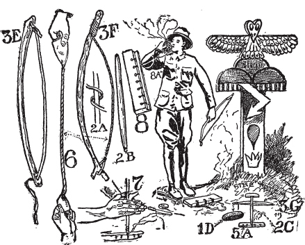 作者有一个大卫·阿伯克伦比少校亲自为他制作的顶帽。这个精美的器具是用坚硬细腻的木材雕刻成甲虫形状(图1B)。它镶嵌着铜和半宝石。凹槽洞是用一些沙子和图23所示的钻头钻入一块翡翠(B)中的。有一段钢管插入木钻的末端,用来在坚硬的翡翠上钻洞。然后将翡翠镶嵌或嵌入顶帽底部的中央,并用胶水固定在那里,如图1B所示。作者还有一个由美国野营俱乐部的埃德蒙·西摩为他制作的顶帽。这个顶帽是一块钻了洞的石化石,如图1A所示。