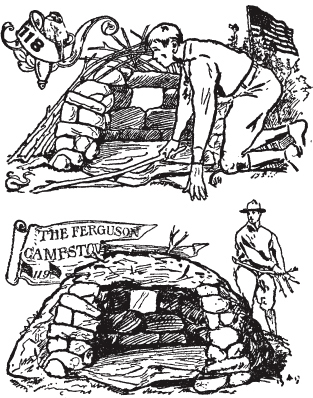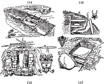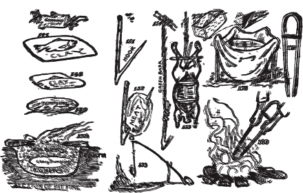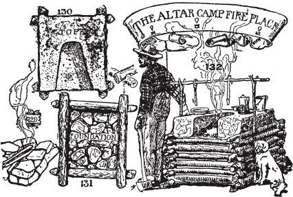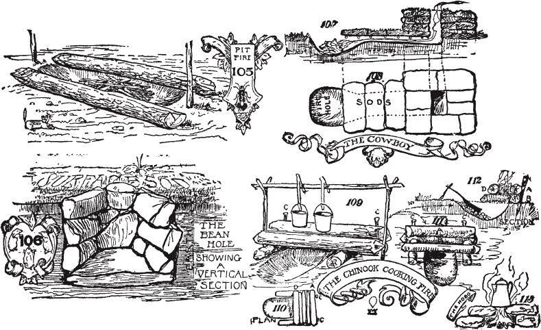 营地坑火、豆洞。牛仔火洞。奇努克烹饪火洞。烧烤坑。淘金者烤炉。弗格森营地炉。土坯烤炉。祭坛营火场所。徒步者、侦察员、探险家、测量员和猎人的营地厨房。如何在没有锅、平底锅或炉子的情况下烹饪肉类、鱼类和面包。处理小动物。如何烧烤大动物。