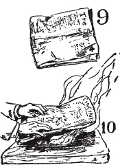 找一块平石头([图10]),一块宽木板,一块光滑、坚硬、裸露的土地;点燃你的布料,当它开始猛烈燃烧后,用折叠的纸片([图9])、一块方形桦树皮或另一块木板快速熄灭它。这样快速拍打火焰会…熄灭它们而不会扰动炭化部分([图10])。或者用你的脚快速踩灭火焰。将你的引火材或引火物保存在防水盒中;锡制烟草盒很适合这个用途,或者像我们的祖先一样——将它保存在引火材号角中([图30])。