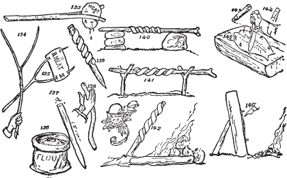 当然,无需告诉任何人可以用放大镜([图25])或相机镜头,或由两片老式手表玻璃组合制成的镜头来生火。但由于太阳并非总是可见,镜头不会在野外丛林中自然生长,在先驱者的营地和木屋中也找不到,而且手表玻璃在野外寿命很短,我们将把这种不用火柴的生火方法归类为课堂教学内容。