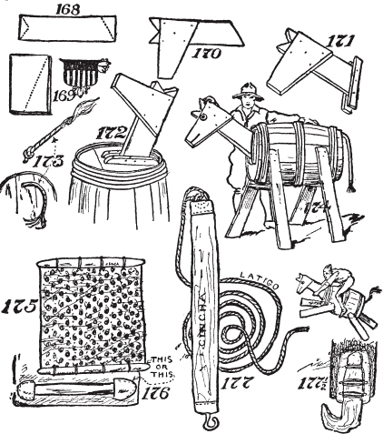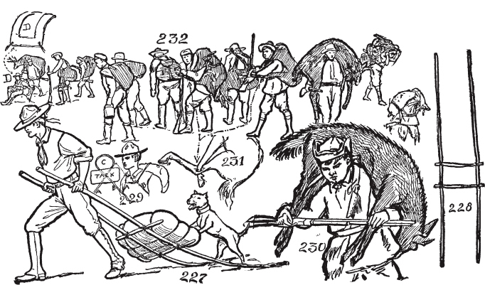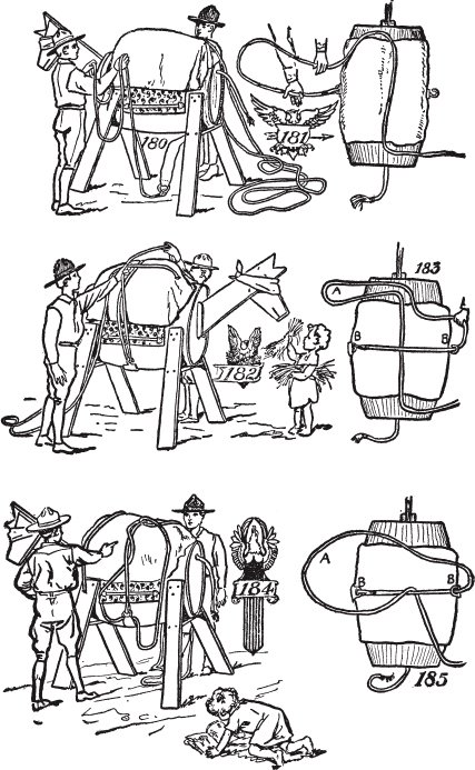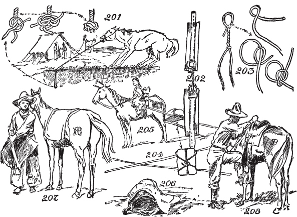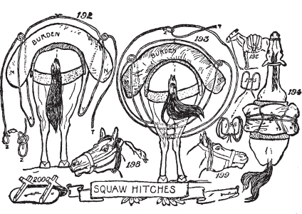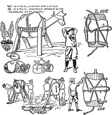 如何制作自己的驮马。如何制作阿帕雷霍(aparejo)垫。如何制作腰带(cincha)。如何制作拉蒂戈(latigo)皮带。如何打钻石结。如何打斯阔结(squaw hitch)。如何在没有柱子、树木、棍子或石头的开阔地上拴马。马绊的使用和制作方法。拖车架的制作和使用。水牛比尔和迈尔斯将军。如何卸马鞍。如何给马上鞍。如何上马。如何识别西部马。
