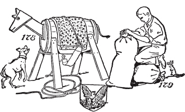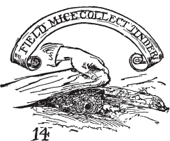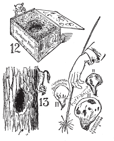 非常细的干草是很好的引火材,还有被称为马勃菌(puff-ball)或恶魔鼻烟盒(Devil’s snuffbox)的蘑菇。大的马勃菌可能在树林边缘找到,它们是很好的引火材或引火物。它们的制备方法是用绳子悬挂并晾干,然后切成薄片,放在板上敲打,直到所有黑色粉尘(“鼻烟”)被敲出,这时它们就可以用作引火材或引火物了([图11])。在古代,有一种从德国进口的蘑菇、毒菌或真菌,用作引火材,但野外技能在于利用手头的材料;因此不要忘记飞鼠([图12]和[13])、白足鼠([图14])和田鼠,或短尾草地鼠,都习惯收集好的