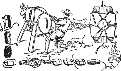 皮绳或皮带系带的缺点是容易太油腻,所以如果能获得一条鹿皮,一根大约两英寸宽的鹿皮带,并将其拧成绳子,可能最适合这个目的(图6)。