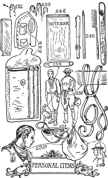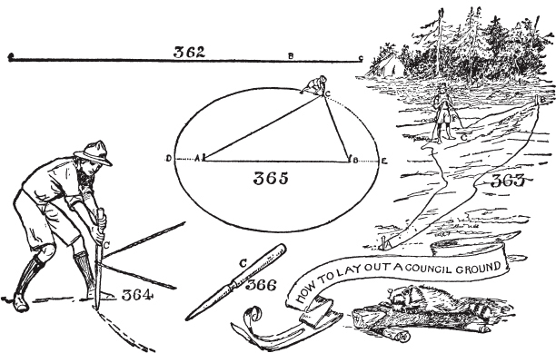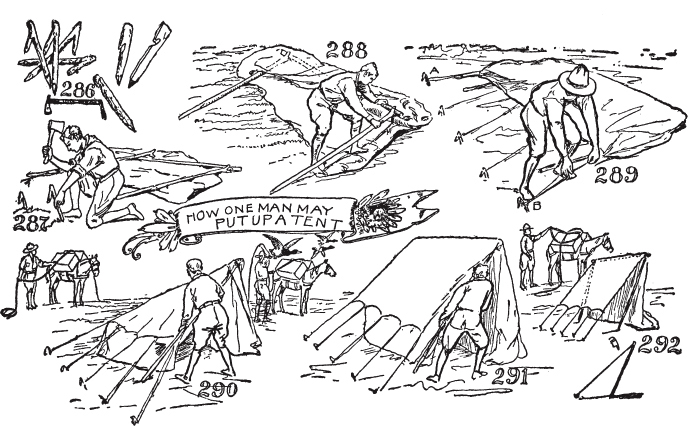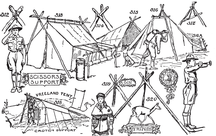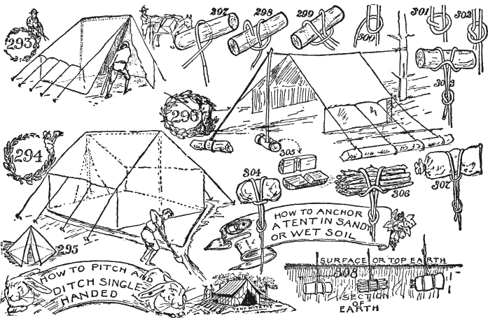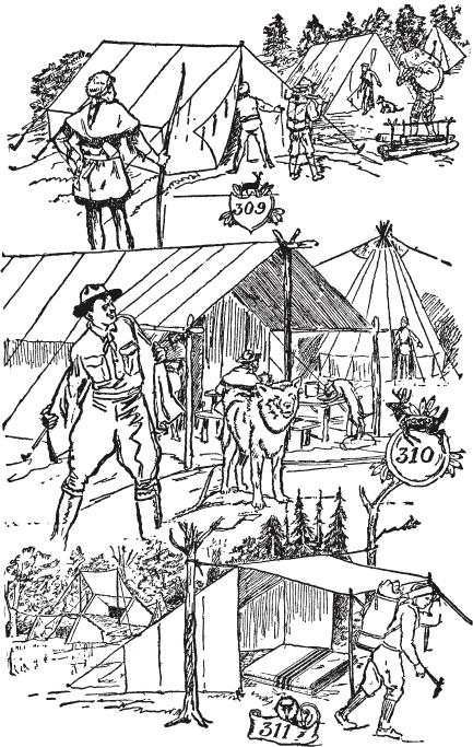 小心独立树木或小树群。森林中的安全。留意好的营地位置。在过河条件良好时过河。保持在蚊子洞的上风处。小心蚂蚁窝。如何判断风向。小屋的演变。如何清扫。如何制作营地床铺。如何分配营地工作。帐篷钉。如何单人搭建帐篷。如何为帐篷挖排水沟。剪刀、滑轮和三脚架的使用