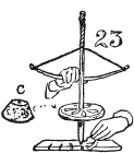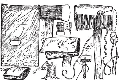 [图23]显示了另一种形式的钻头。对于这种钻头,需要在纺锤的下部安装一个重轮。在其中心打一个孔,钻头安装到这个孔上。[图23]中的那个装有一个我在谷仓下面找到的生锈铁轮。[图23]C显示了一个陶制重轮,这是我许多年前在俄亥俄州辛辛那提市米尔斯溪底部的砾石坑中发现的。它是砖红色的,装饰着奇怪的字符。多年来,我不知道这个独特的工具是用来做什么的。我把它送给了法拉盛高中(长岛),我相信它仍然在那里。火钻通过上下移动弓而不是前后移动来旋转。