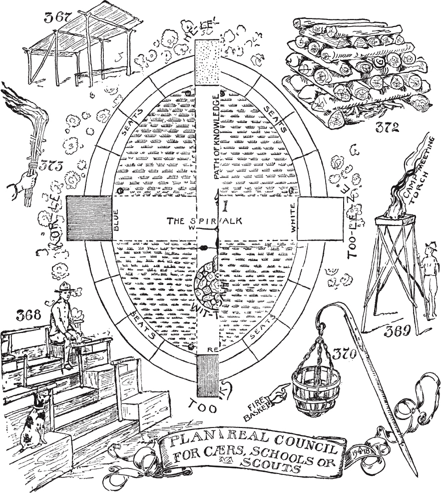 议事篝火的仪式可以配合任何程度的盛大表演。在丹·比尔德户外学校的议事篝火上,官员们身着服装;不是化妆服装,而是真正的服装。北方之人,负责北极光,身穿北方伐木工人的毛毯衣服,手持斧头。东方之人,照料太阳少女居住的火焰,可能身穿我们清教徒祖先的衣服。西方之人,照料蓝山之火,身着有流苏的鹿皮衣服,如捕兽者、平原人或登山者。南方之人,守护红山之火,身着墨西哥人的风景如画的服装,戴着高顶宽边帽。不同法庭的座位用法庭的颜色装饰。