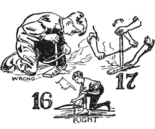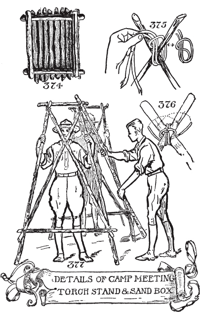 我在丛林工艺营地(Woodcraft Camp)的学生们成功地用椅子的横档作为纺锤,用包装箱的一块木板作为火板,另一块作为插孔木,用他们鹿皮靴的绳子作为弓弦来生火。然而他们没有使用弓,需要两到三个男孩来生火,一个拿着纺锤,另外两个在鹿皮靴绳子上锯动([图17])。