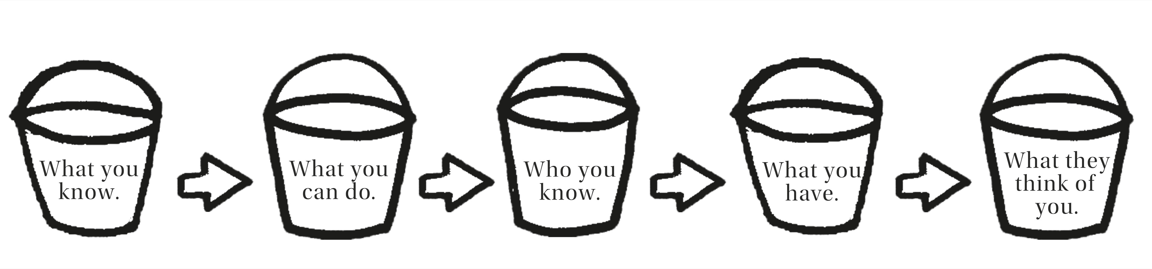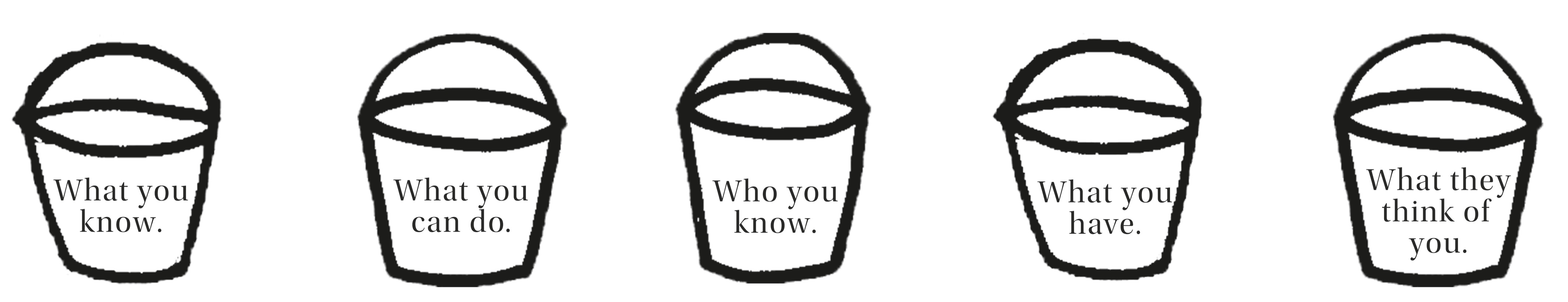 这五个桶的总和就是你职业潜能的总和。这些桶的饱满程度将决定你的梦想对你自己以及听到它们的人来说有多大、多可信和多可实现。