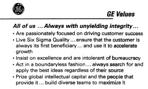 围绕这个有形的核心理念,我们将融入这些无形的核心价值观——统一的主导主题,由于通用电气的共同文化,这些主题将成为组织中的第二天性。第一个我们称之为”现实”,第二个我们称之为”质量/卓越”,第三个是”人的因素”。