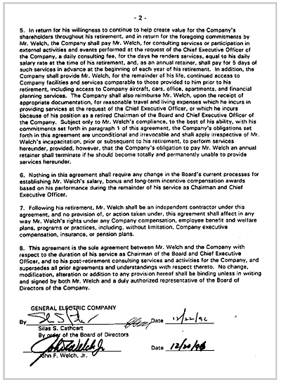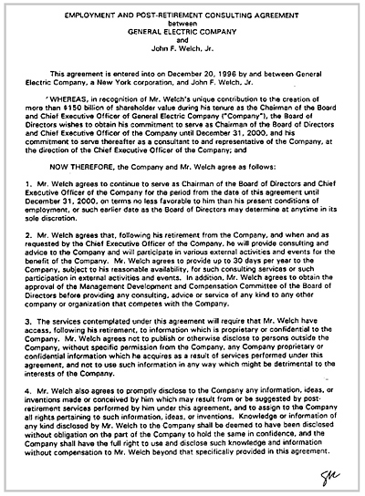 我的雇佣合同是1996年签订的。当时通用电气业绩出色,正处于新CEO继任计划的第二年。董事会知道我热爱我的工作,坦白说,我没有离开的打算,尽管媒体不断传言其他公司在挖我。