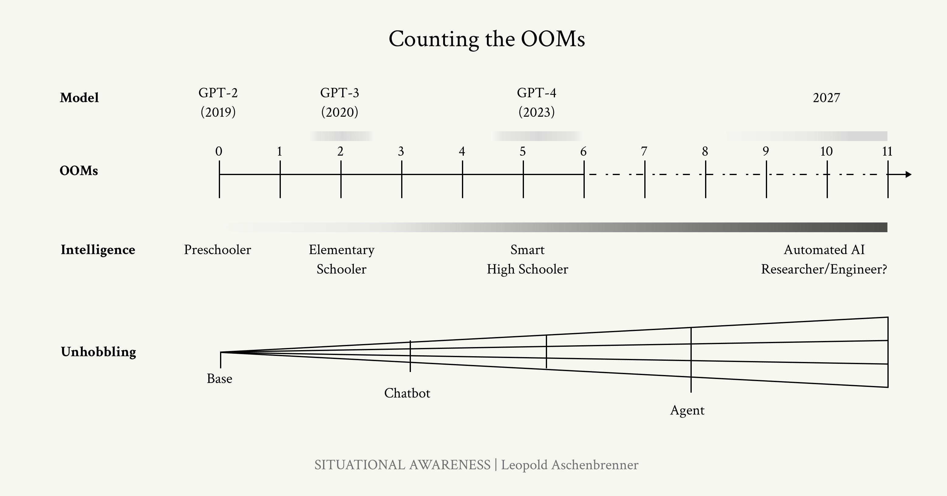 到2027年实现AGI是非常可信的。从GPT-2到GPT-4,我们在4年内从学龄前儿童能力发展到聪明高中生能力。追踪计算能力的趋势线(每年0.5个数量级或OOMs)、算法效率(每年0.5个OOMs)和”去束缚”收益(从聊天机器人到智能体),我们应该预期到2027年会有另一次从学龄前儿童到高中生规模的质的飞跃。