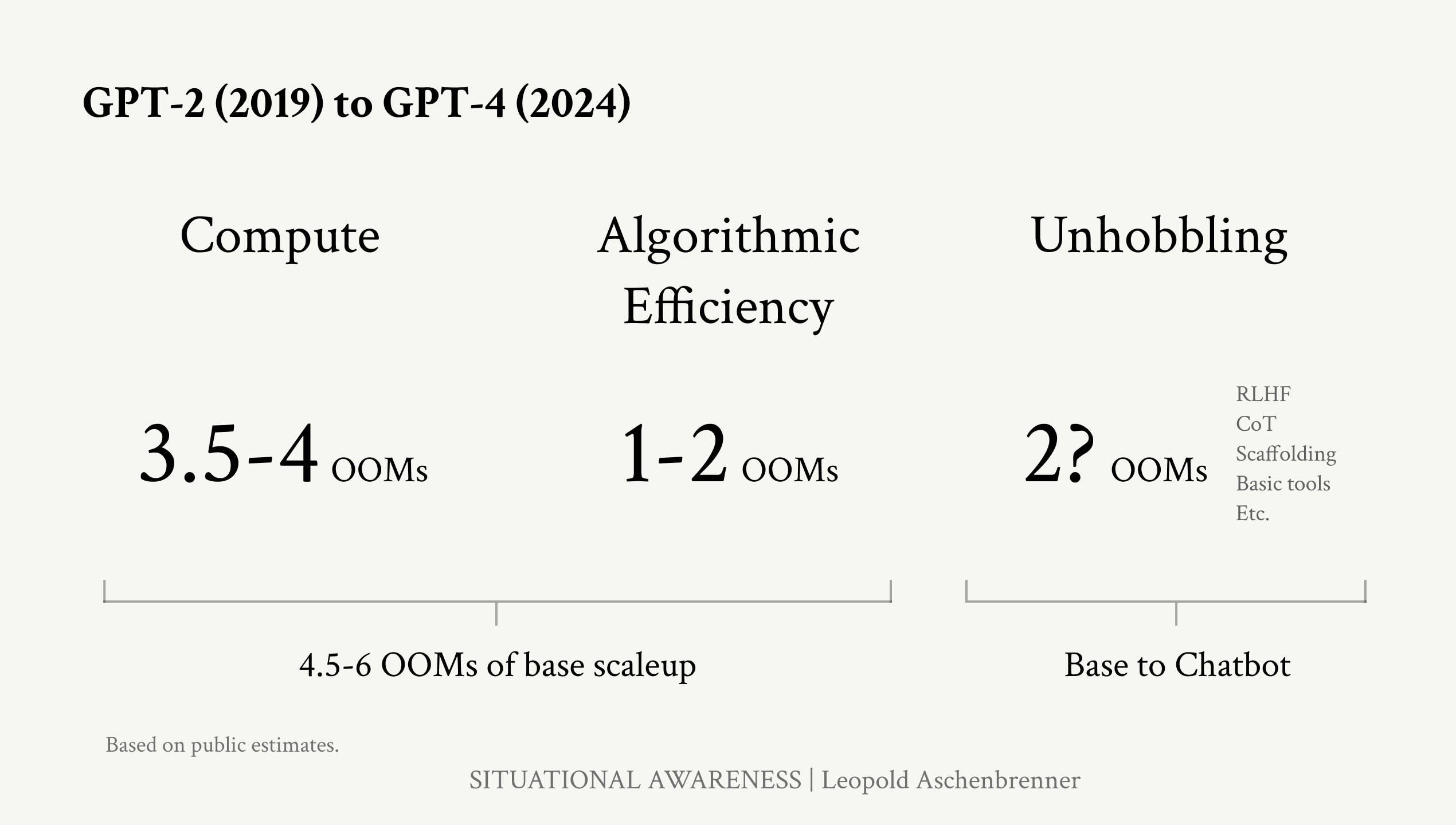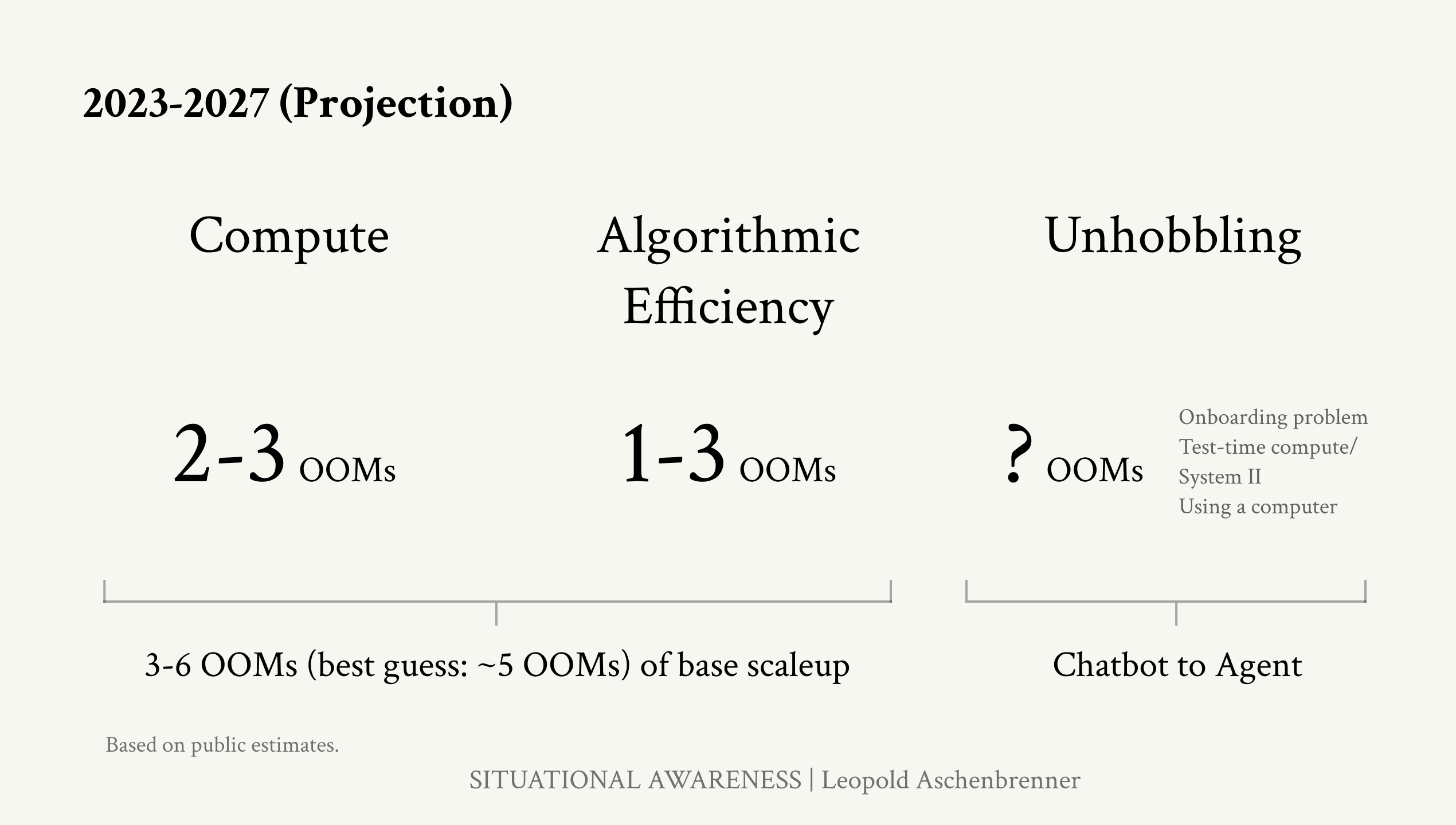 在这篇文章中,我将简单地”数数量级”(OOM = 数量级,10倍 = 1个数量级):查看1)计算能力、2)算法效率(可以视为增长”有效计算”的算法进步)和3)“去束缚”增益(修复模型默认被束缚的明显方式,释放潜在能力并为其提供工具,导致实用性的阶跃变化)的趋势。我们追踪GPT-4之前四年中每项的增长,以及在2027年底之前的四年中我们应该期待什么。鉴于深度学习在每个有效计算数量级上的一致改进,我们可以用这个来预测未来的进步。