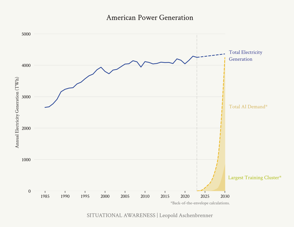 过去一年里,业界的讨论话题从100亿美元的计算集群转向了1000亿美元的集群,再到万亿美元的集群。每六个月,董事会的计划就会多加一个零。在幕后,人们正在激烈地争夺本世纪剩余时间内仍可获得的每一份电力合同,每一台可能采购到的电压变压器。美国大企业正在准备投入数万亿美元,进行一场长期未见的美国工业实力动员。到本世纪末,美国的电力生产将增长数十个百分点;从宾夕法尼亚的页岩油田到内华达的太阳能农场,数以亿计的GPU将嗡嗡运转。