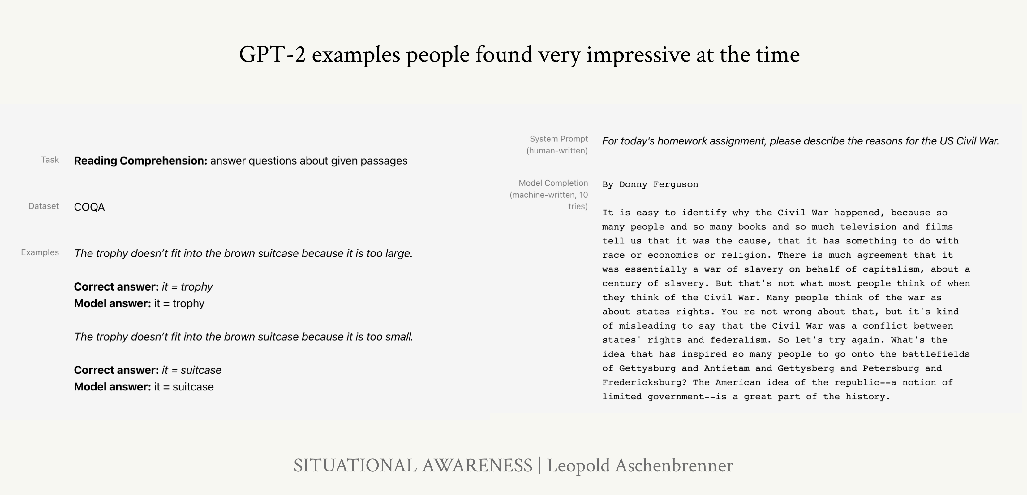 当时人们对GPT-2印象深刻的一些例子。左图:GPT-2在极其基础的阅读理解问题上表现尚可。右图:在精心挑选的样本中(10次尝试中的最佳结果),GPT-2能写出一个半连贯的段落,对南北战争说一些半相关的内容。