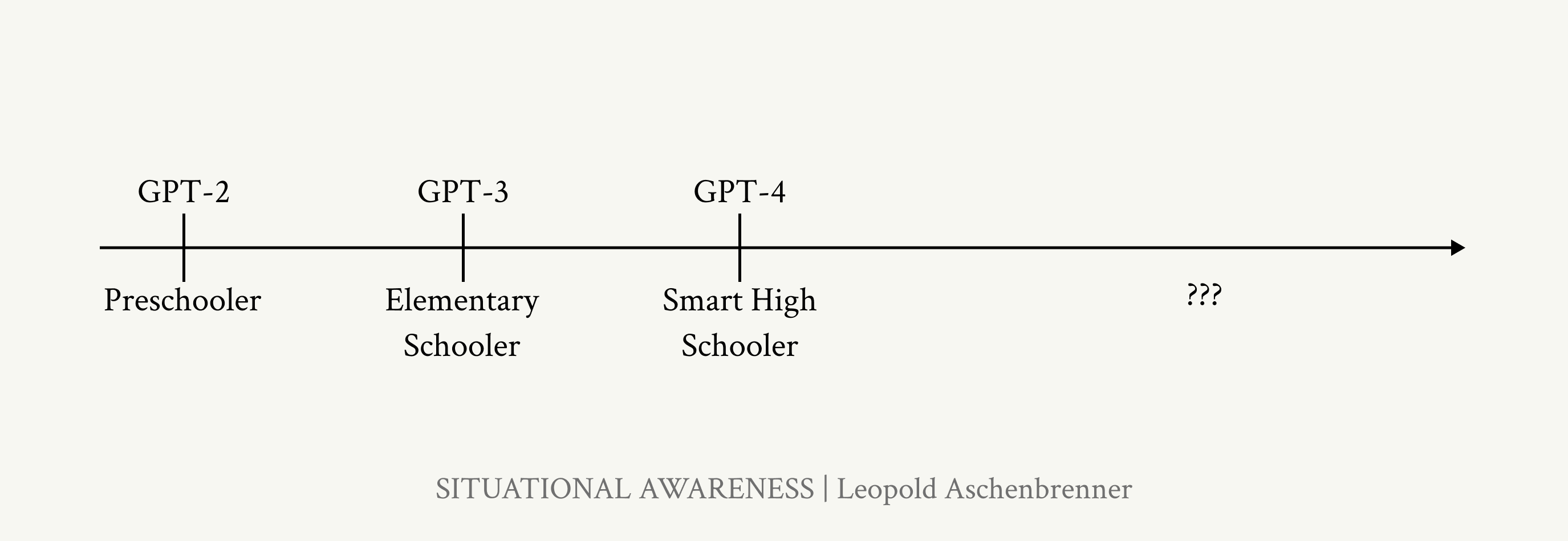 到2027年实现AGI具有惊人的可行性。从GPT-2到GPT-4,我们在4年时间里从~学龄前儿童水平提升到~聪明高中生水平的能力。通过追踪计算能力(~每年0.5个数量级)、算法效率(~每年0.5个数量级)和”去束缚”增益(从聊天机器人到智能体)的趋势线,我们应该期待到2027年会有另一次从学龄前儿童到高中生水平的质的飞跃。