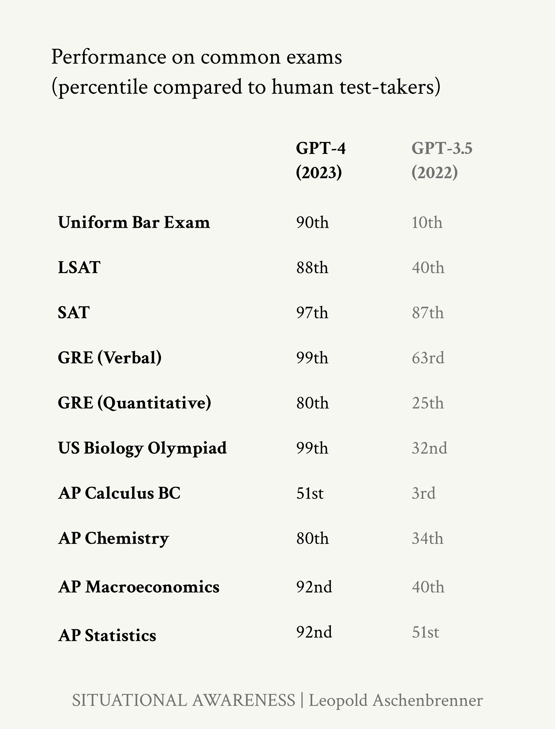 GPT-4 (2023) ~ 聪明的高中生:“哇,它能编写相当复杂的代码并迭代调试,能就复杂主题进行智能而复杂的写作,能推理解决困难的高中竞赛数学题,在我们能给出的任何测试中都击败了绝大多数高中生等等。” 从代码到数学再到费米估算(Fermi estimates),它能思考和推理。GPT-4现在在我的日常任务中很有用,从帮助编写代码到修订草稿。