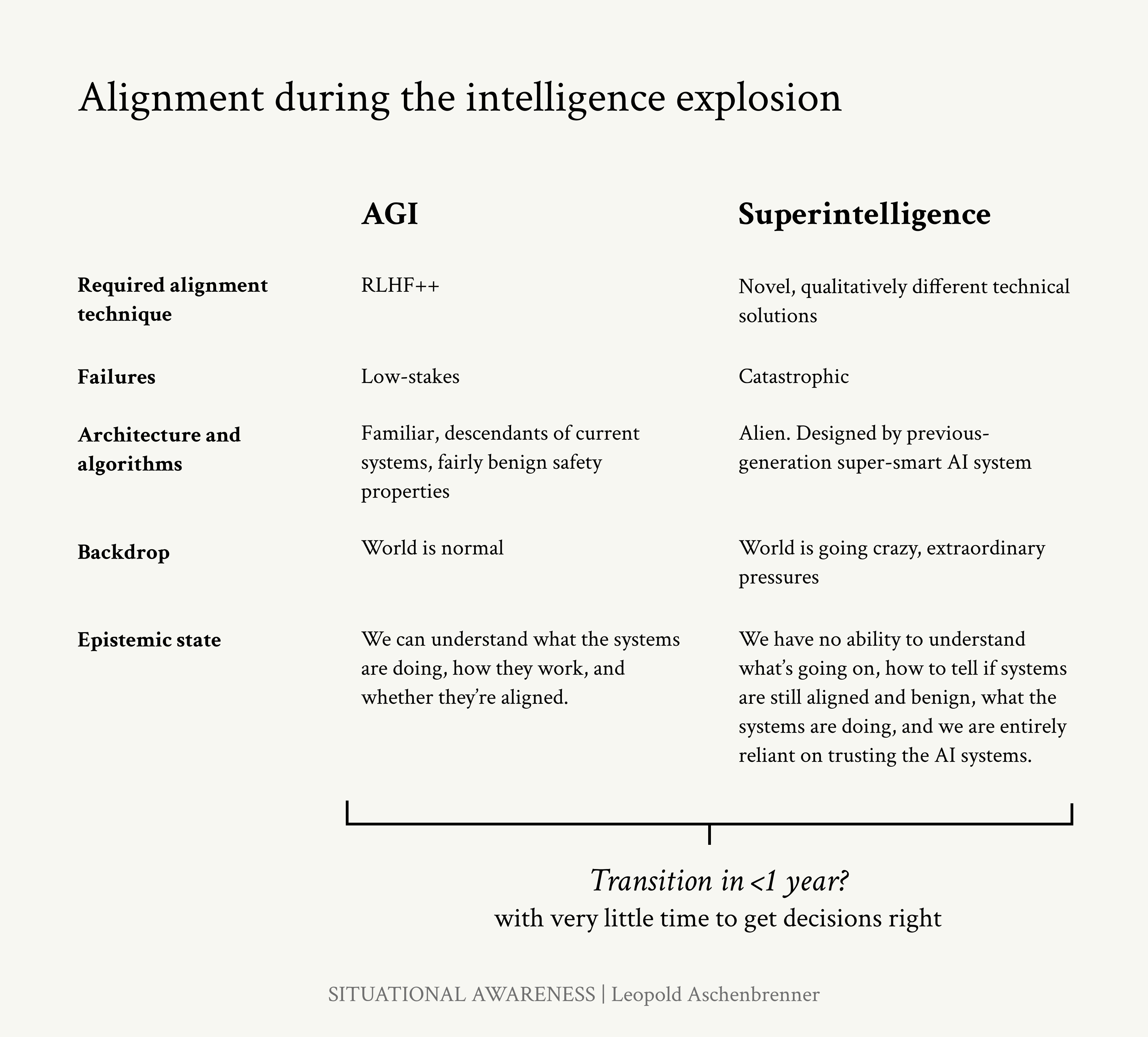 我们将面临疯狂的一年,情况每周都在极速变化,基于模糊数据的艰难决定将关乎生死,解决方案——甚至问题本身——都不会提前完全明确,而是归结为在”战争迷雾”中的能力,这将涉及疯狂的权衡,比如”我们的一些对齐测量看起来模糊,我们不再真正理解发生了什么,可能没问题,但有一些警告信号表明下一代超级智能可能会出错,我们应该延迟下一次训练运行3个月以获得更多安全信心——但糟糕,最新情报报告显示中国偷了我们的权重并在自己的智能爆炸上抢跑,我们该怎么办?“。