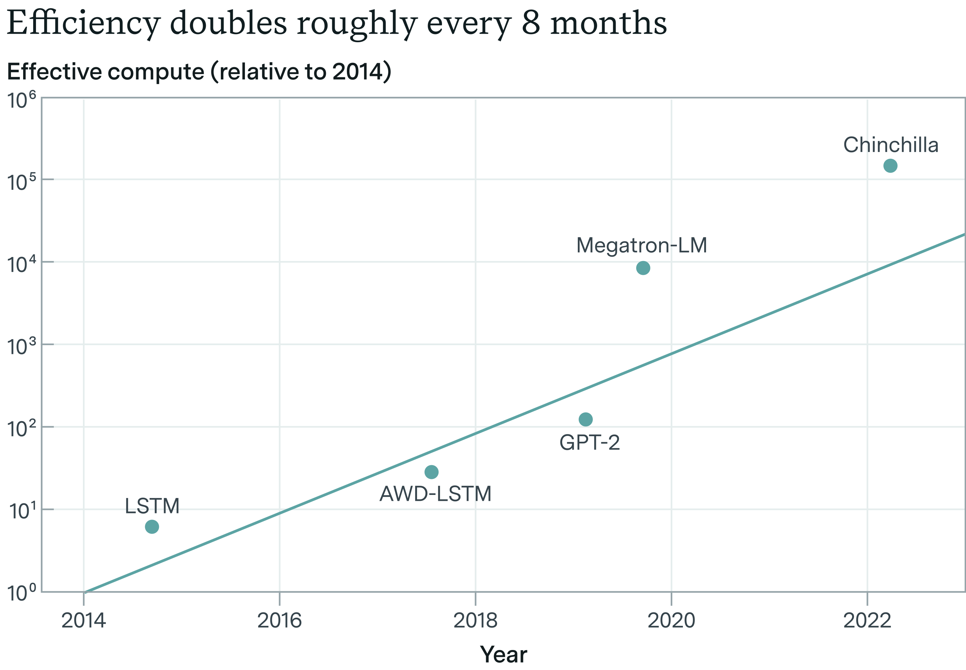 算法效率:存在持续的算法进步趋势。其中许多作为”算力乘数”,我们可以将它们放在有效算力增长的统一尺度上。