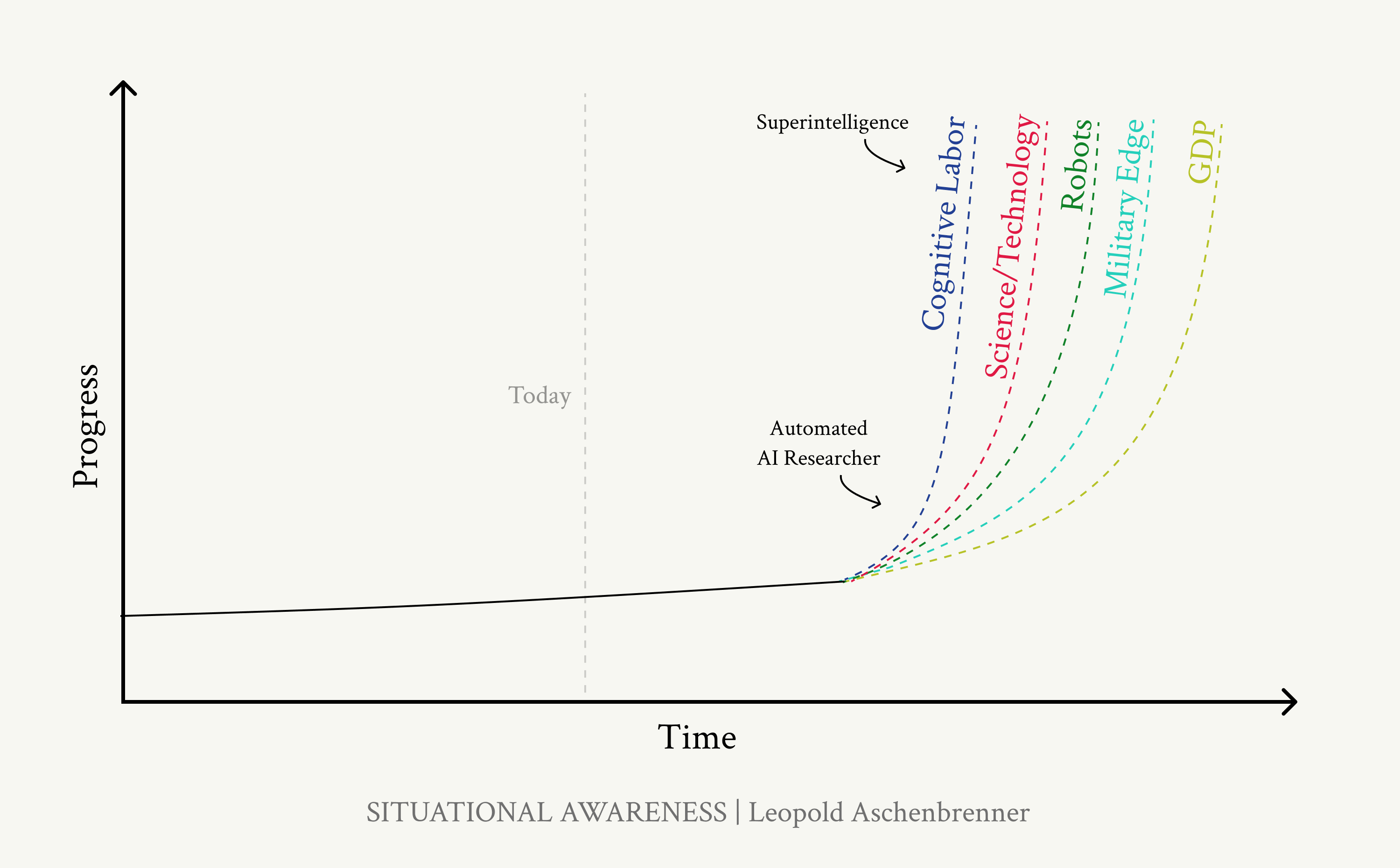 AGI竞赛已经开始。我们正在建造能够思考和推理的机器。到2025/26年,这些机器将超越许多大学毕业生。到本世纪末,它们将比你我更聪明;我们将拥有真正意义上的超级智能。在此过程中,半个世纪未见的国家安全力量将被释放,不久之后,“项目”就会启动。如果我们幸运,我们将与中国共产党展开全面竞赛;如果不幸运,则是一场全面战争。