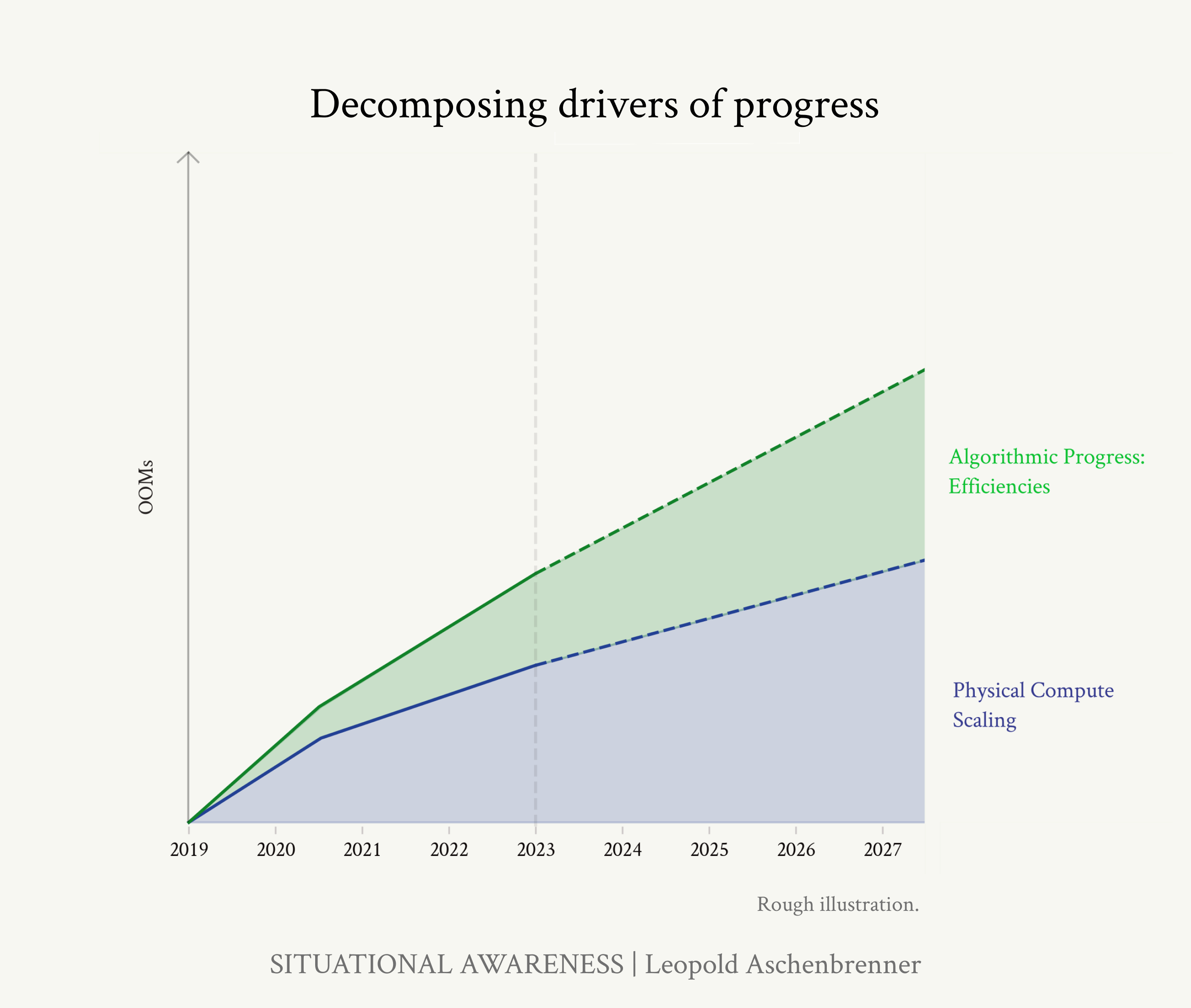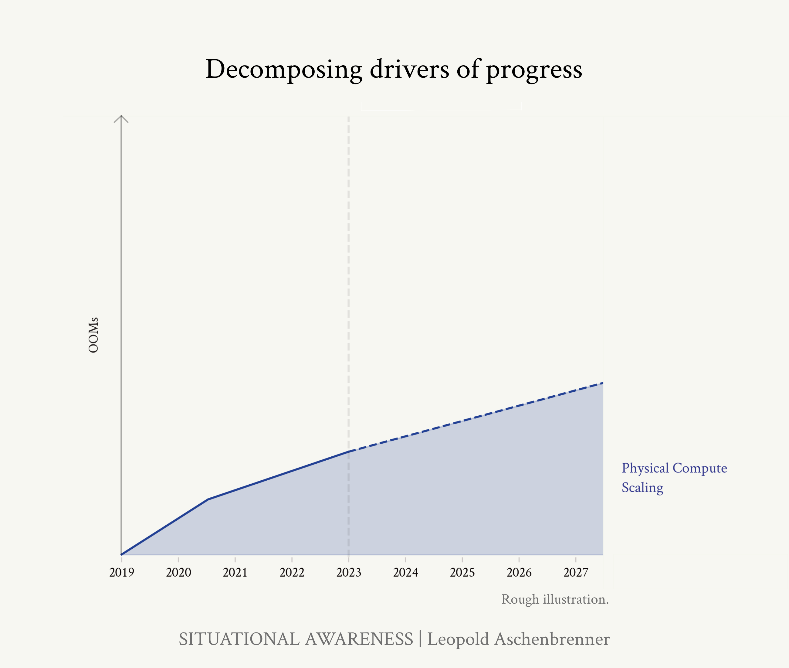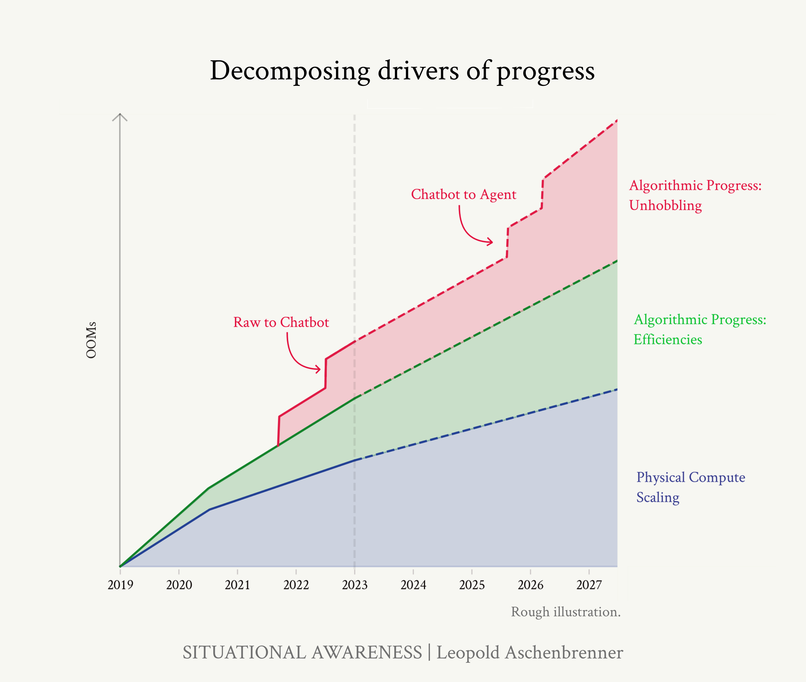 我将逐一介绍每个方面,但要点很清楚:我们正在快速穿越 OOMs。数据墙存在潜在的阻力,我将予以解决——但总的来说,到 2027 年,我们似乎可能在 GPT-4 的基础上期待另一个 GPT-2 到 GPT-4 规模的跃迁。