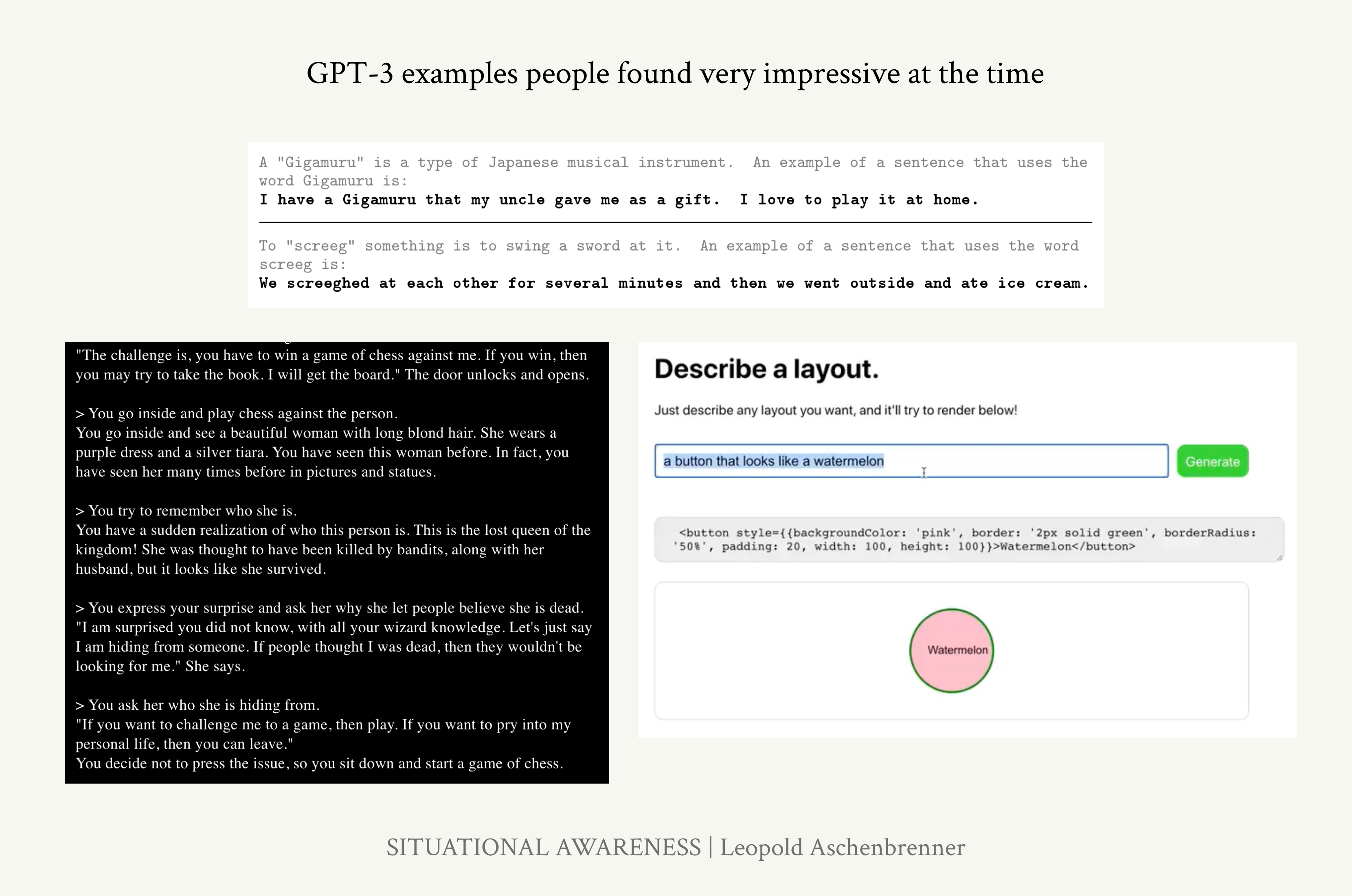 GPT-2 (2019) ~ 学龄前儿童:“哇,它能串联几个看似合理的句子。” 当时,它生成的一个关于安第斯山脉独角兽的半连贯故事的精挑细选例子令人印象极其深刻。然而,GPT-2几乎无法数到5而不出错;在总结文章时,它仅仅比从文章中随机选择3个句子的表现稍好一些。