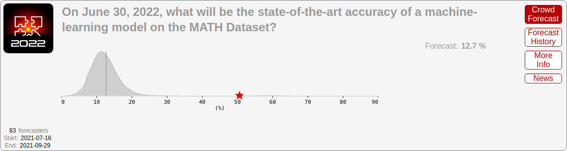灰色:2021年8月做出的专业预测,针对2022年6月在MATH基准测试(来自高中数学竞赛的困难数学问题)上的表现。红色星号:2022年6月的实际最先进表现,远超预测者给出的上限范围。机器学习研究人员的中位数预测甚至更悲观。