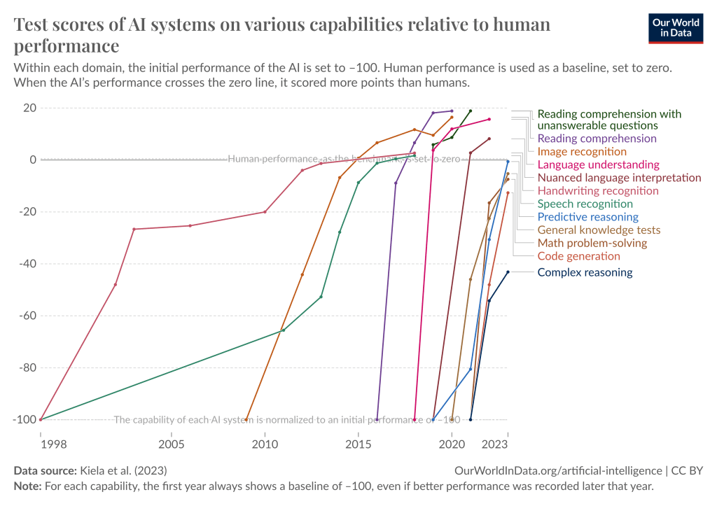 深度学习系统在许多领域正在快速达到或超越人类水平。图表:Our World in Data