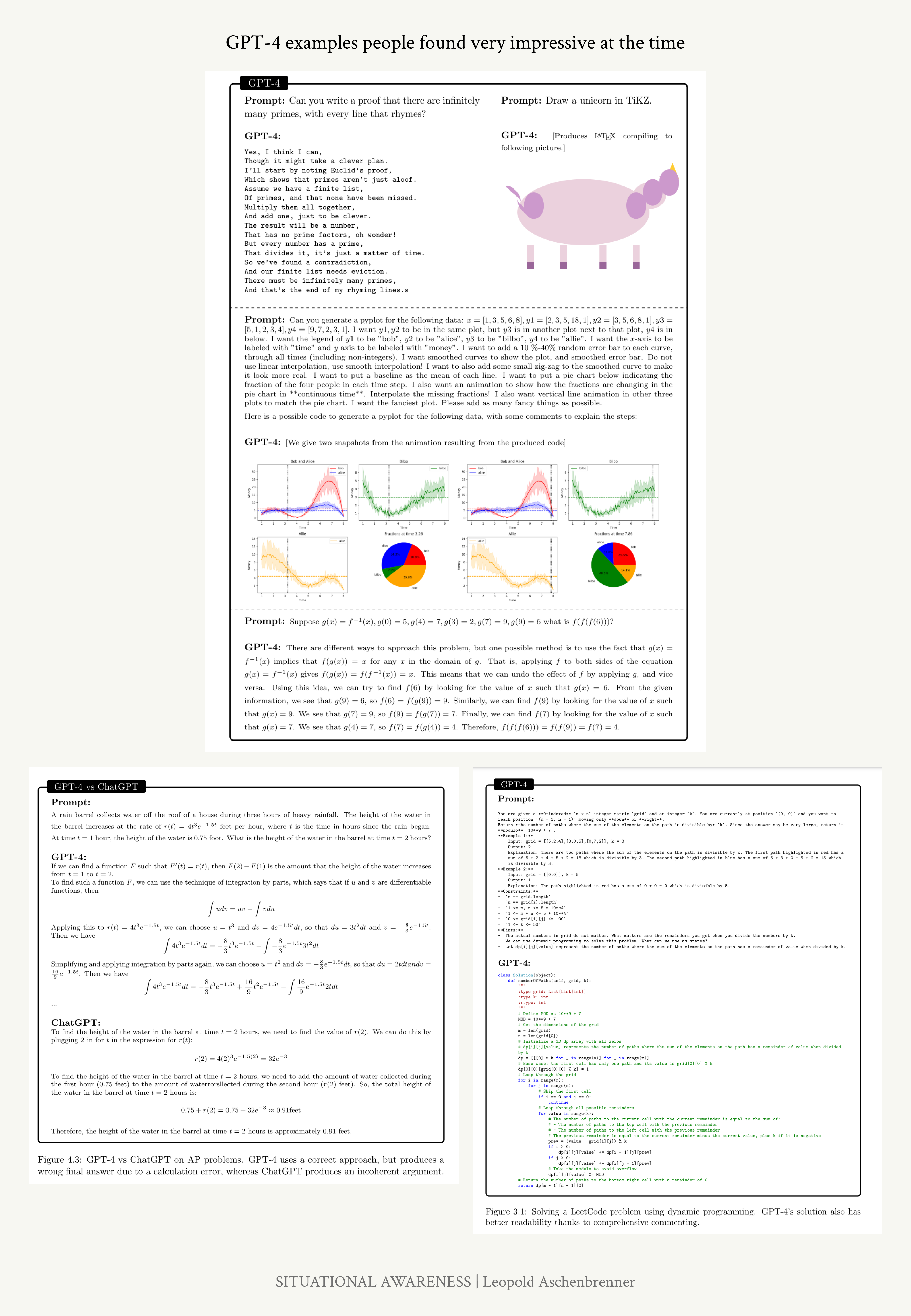 GPT-4发布时人们印象深刻的一些表现,来自”AGI之火花”论文。顶部:它正在编写非常复杂的代码(生成中间显示的图表)并能推理解决重要的数学问题。左下:解决AP数学问题。右下:解决相当复杂的编程问题。更多有趣的GPT-4能力探索摘录在这里。