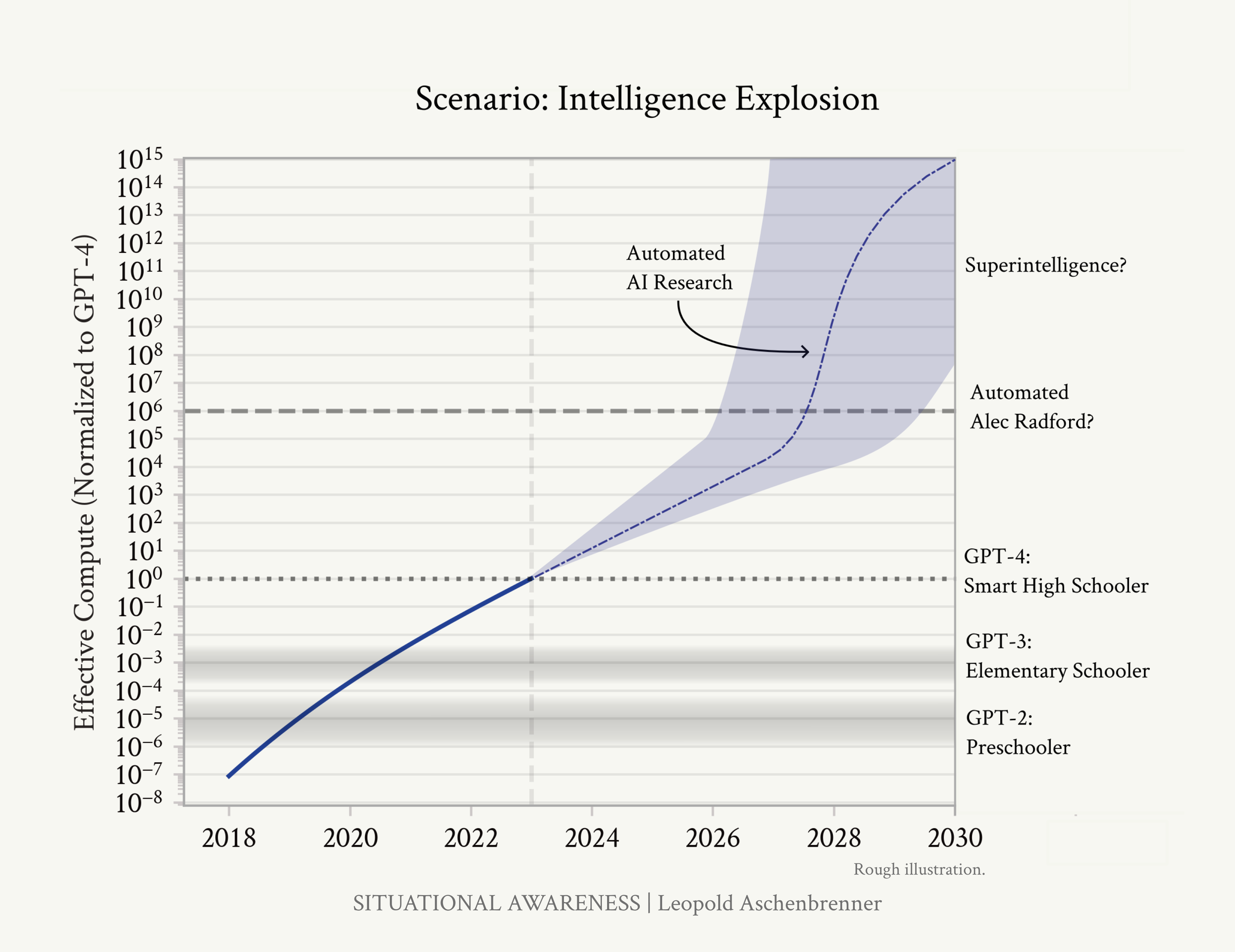 因此到27/28年,终局阶段将会到来。到28/29年,智能爆炸将会展开;到2030年,我们将召唤出超级智能,带着它所有的力量和威能。