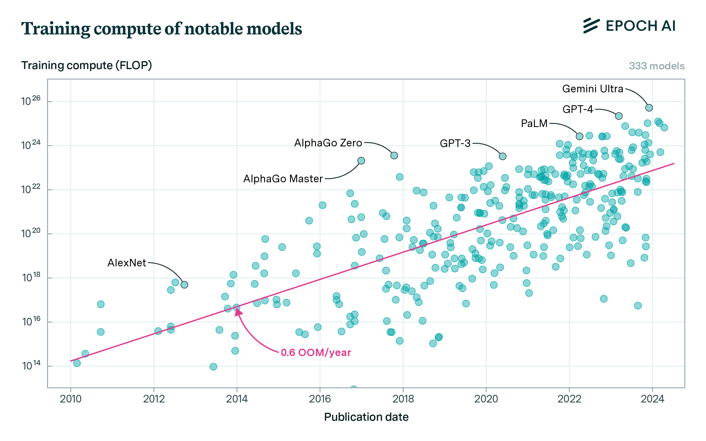 随时间变化的著名深度学习模型训练算力。来源:Epoch AI