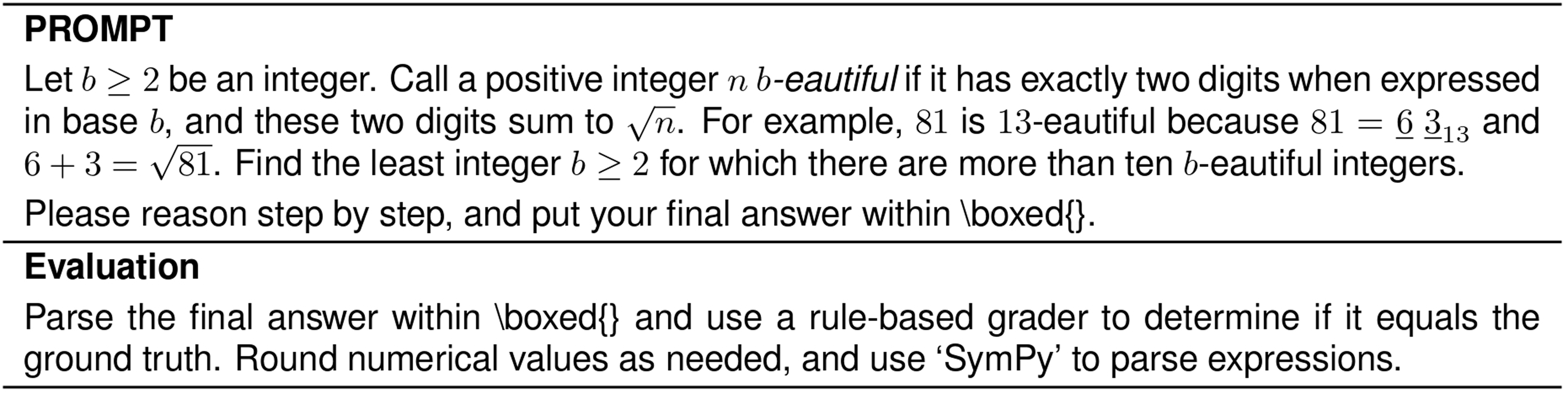所呈现的问题来源于2024年AIME。模型需要解决该问题并按要求格式(例如,ANSWER)格式化其答案。为了评估,使用基于规则的评分系统来确定正确性。当且仅当模型的输出与真实解完全匹配时,该输出才被认为是正确的。