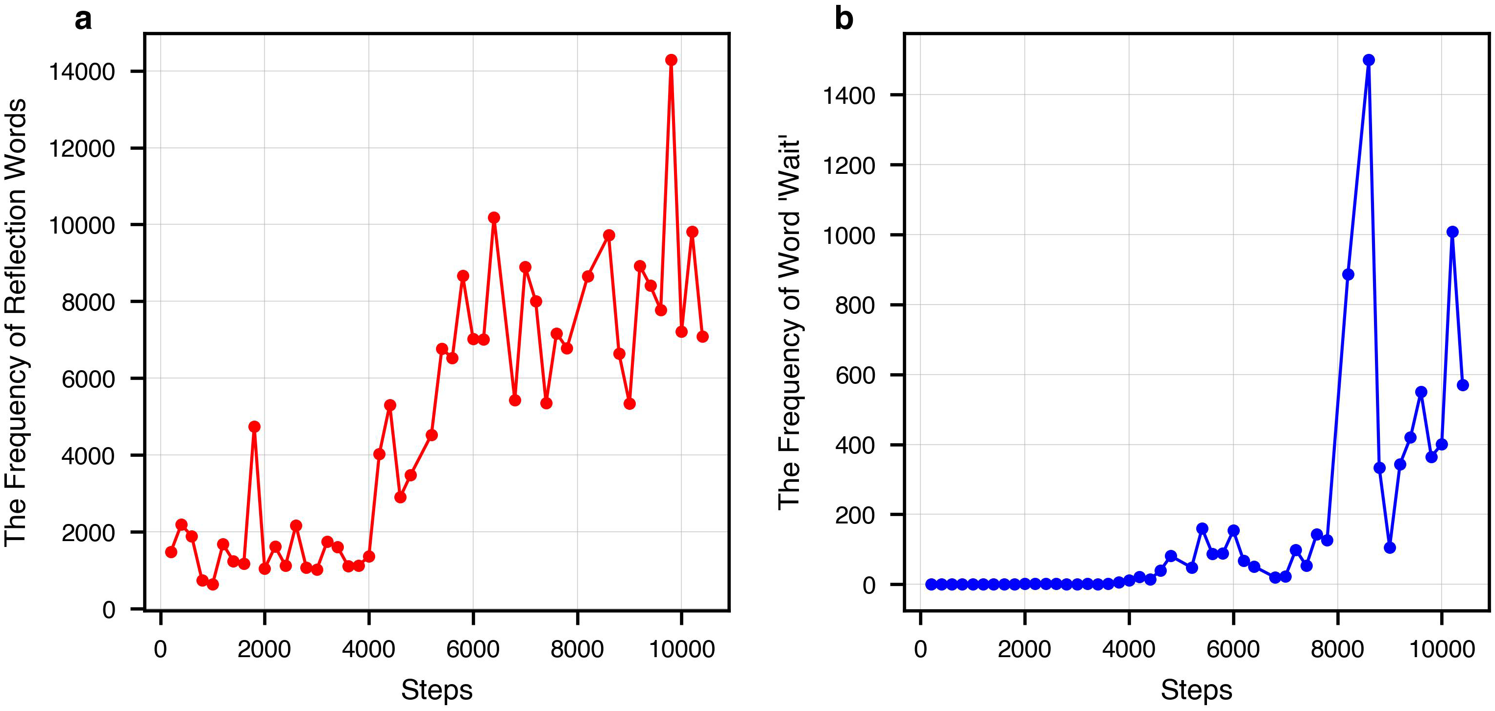 在训练期间,DeepSeek-R1-Zero还展现出自我进化行为和RL训练。如图1b所示,除了推理能力的逐步增强,DeepSeek-R1-Zero在整个训练过程中表现出思考时间的稳定增长,这仅由内在适应而非外部修改驱动。利用长链式思维(CoT),模型逐步完善其推理,生成数百到数千个词元来探索和改进其问题解决策略。
