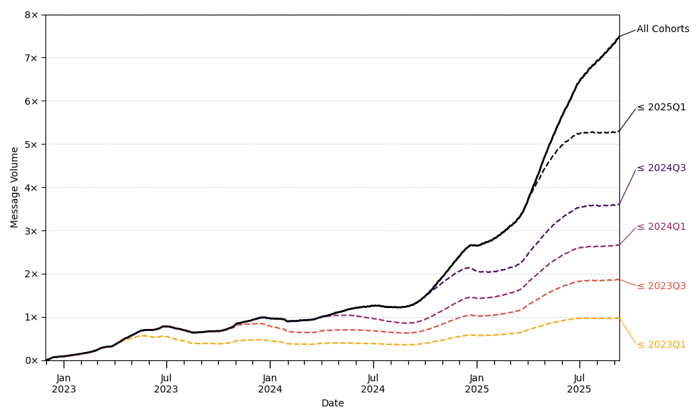 图[4]展示了用户发送消息总量随时间的增长。实线显示,在2024年7月至2025年7月之间,发送的消息数量增长了5倍多。