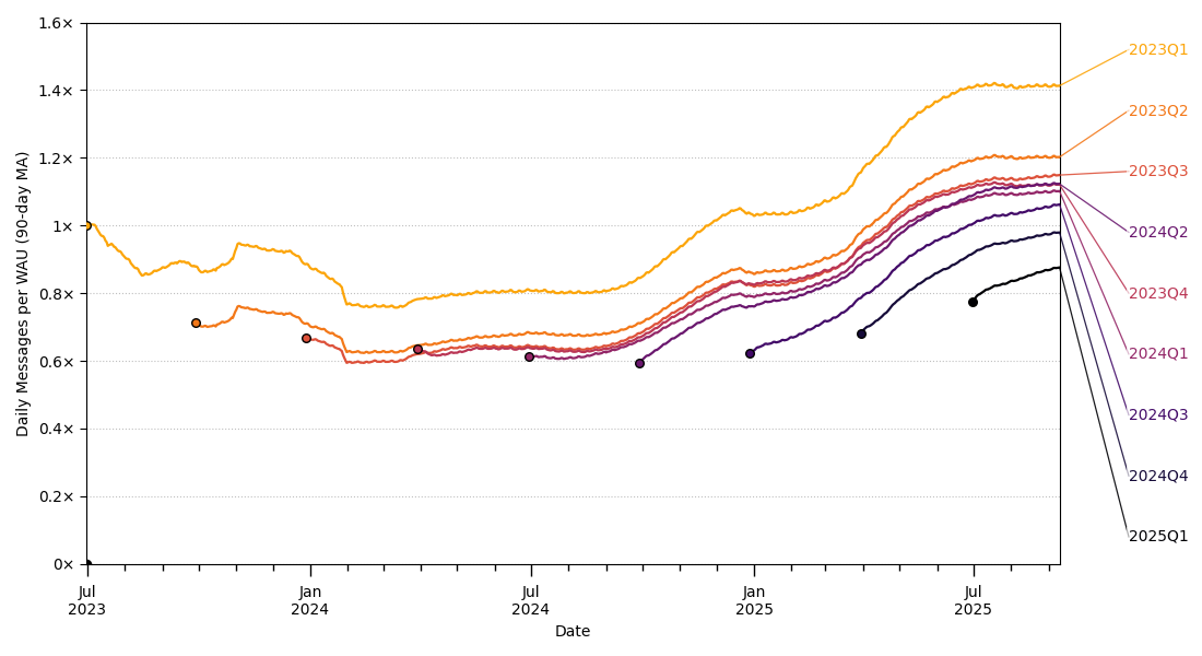 图[5]对每个群体进行标准化,绘制每周活跃用户的日消息数。每条线代表一个单独的群体(而不是像图[4]中的累积群体)。该图显示较早注册的用户一直有较高的使用率,但每个群体内的使用率也在持续增长,我们将此解释为由于(1)模型能力的改进,以及(2)用户逐渐发现现有能力的新用途。