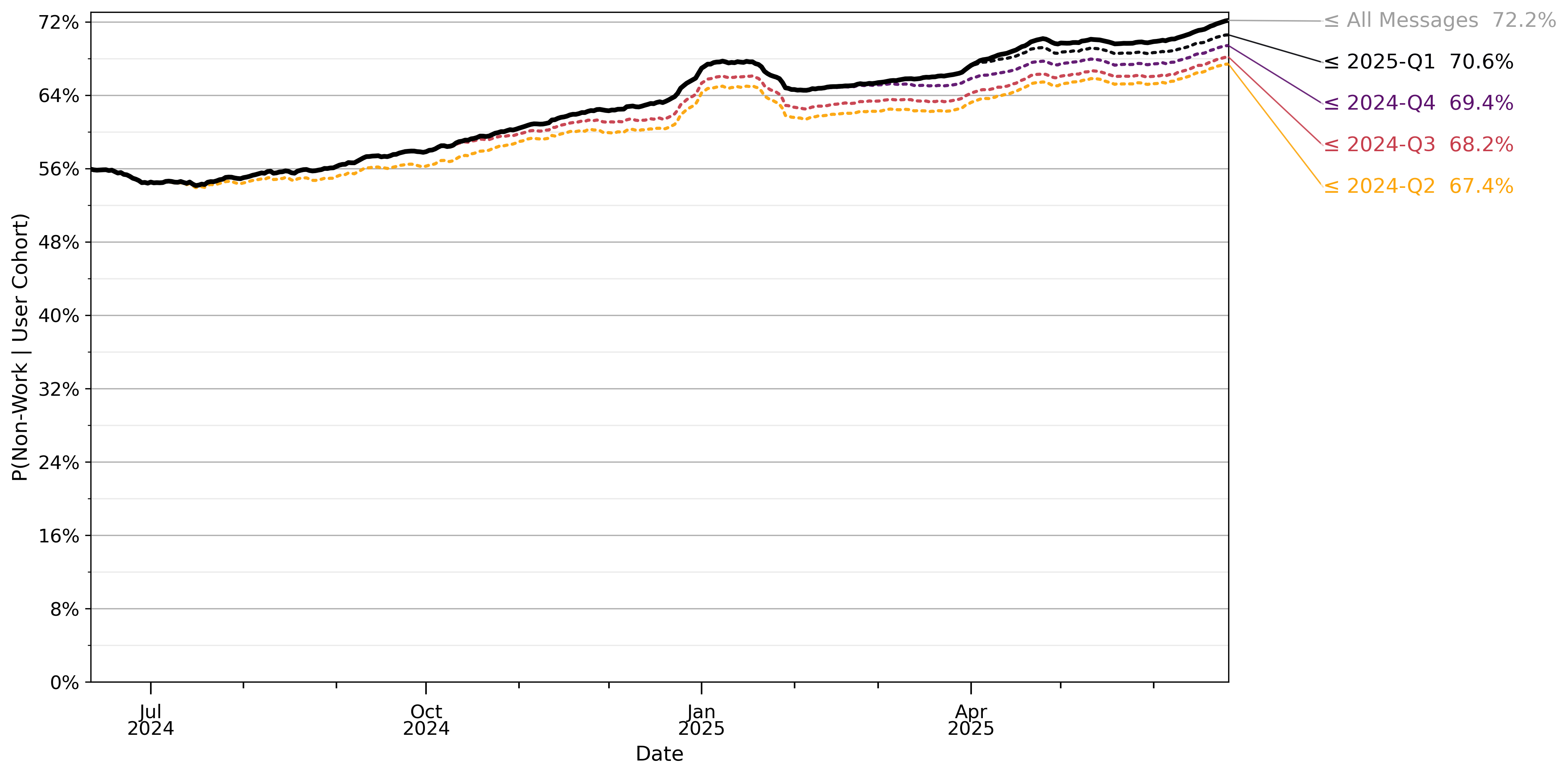 消息量持续增长,但非工作消息增长更快,现在占所有消费者ChatGPT消息的70%以上。虽然大多数关于AI的经济分析都专注于其对有偿工作生产力的影响,但对工作之外活动(家庭生产)的影响规模相似,可能更大。与工作相关消息份额的下降主要是由于每个用户群体内使用方式的变化,而不是新ChatGPT用户构成的变化。这一发现与Collis和Brynjolfsson (2025)的研究一致,他们使用选择实验来揭示对生成式AI的支付意愿,估计仅在2024年美国的消费者剩余就至少达到970亿美元。