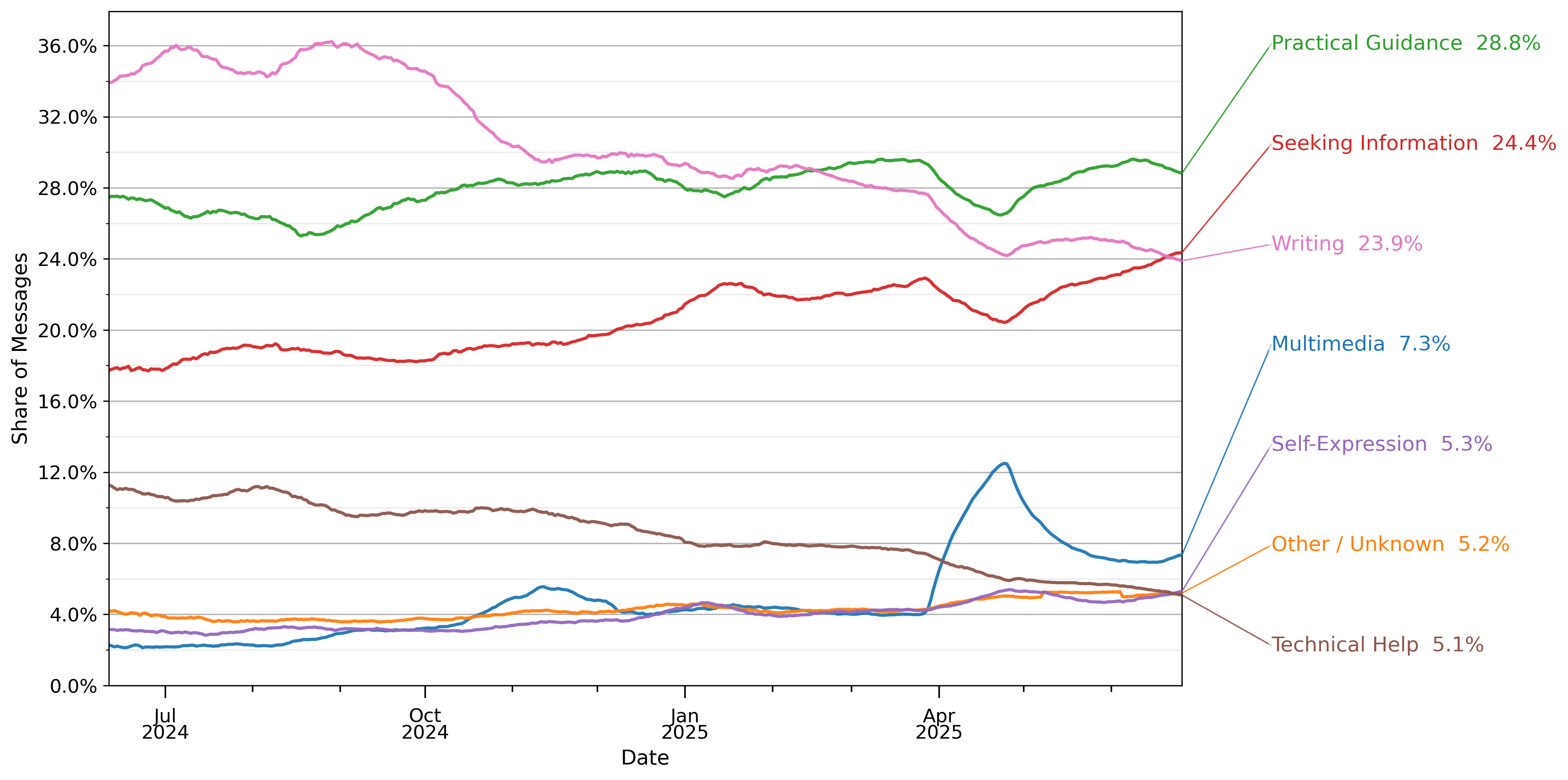 接下来我们报告使用OpenAI开发的分类法对消息进行分类,该分类法用于理解产品使用情况(“对话分类器”)。近80%的ChatGPT使用都属于三个主要类别,我们称之为实用指导、寻求信息和写作。实用指导是最常见的用例,包括辅导和教学、关于各种主题的操作建议以及创意构思等活动。寻求信息包括搜索关于人物、时事、产品和食谱的信息,似乎是网络搜索的一个非常接近的替代品。写作包括电子邮件、文档和其他通信的自动化生产,也包括编辑、批评、总结和翻译用户提供的文本。写作是工作中最常见的用例,2025年6月平均占与工作相关消息的40%。大约三分之二的写作消息要求ChatGPT修改用户文本(编辑、批评、翻译等),而不是从头创建新文本。大约10%的所有消息都是辅导或教学请求,表明教育是ChatGPT的一个关键用例。